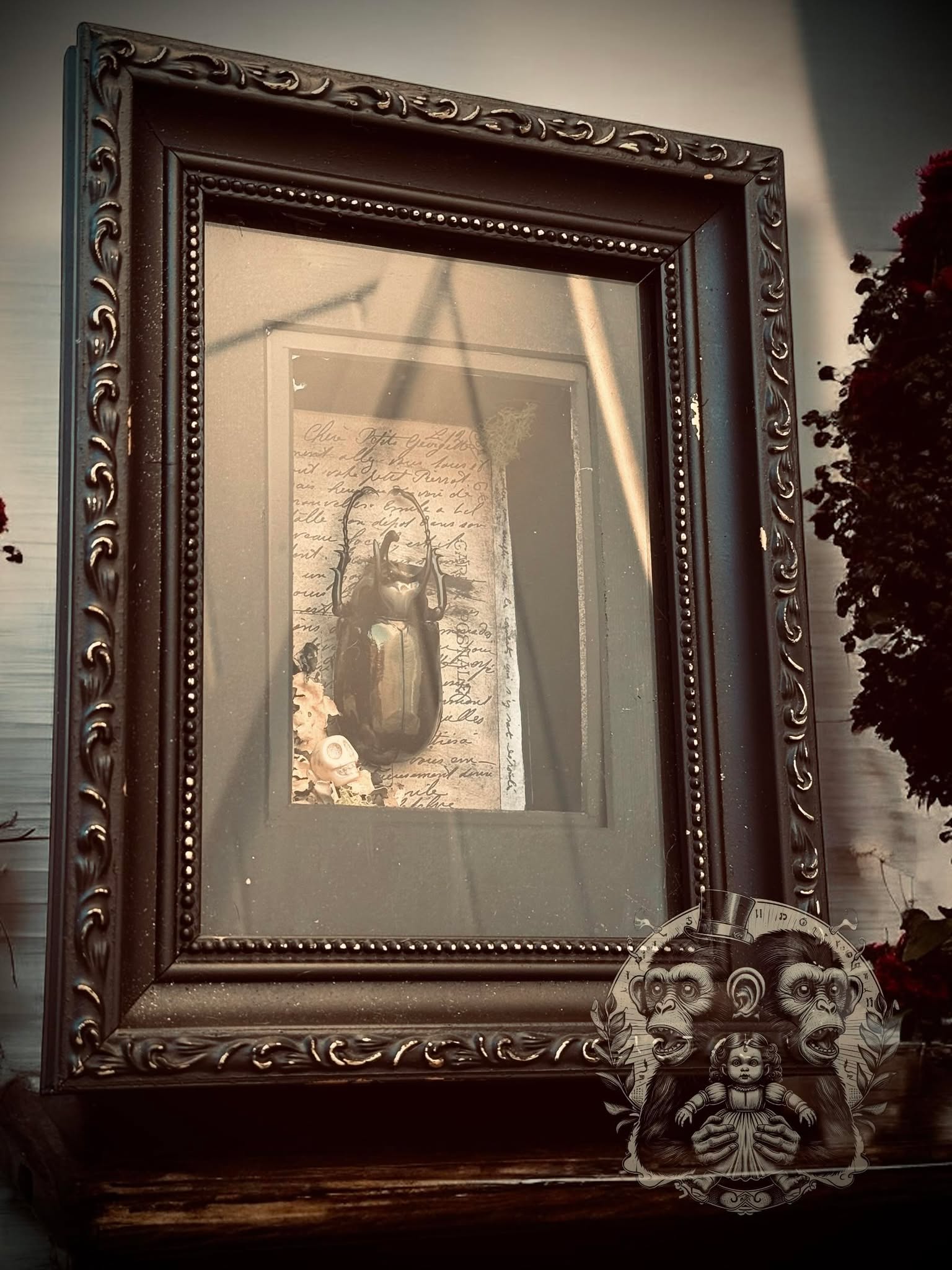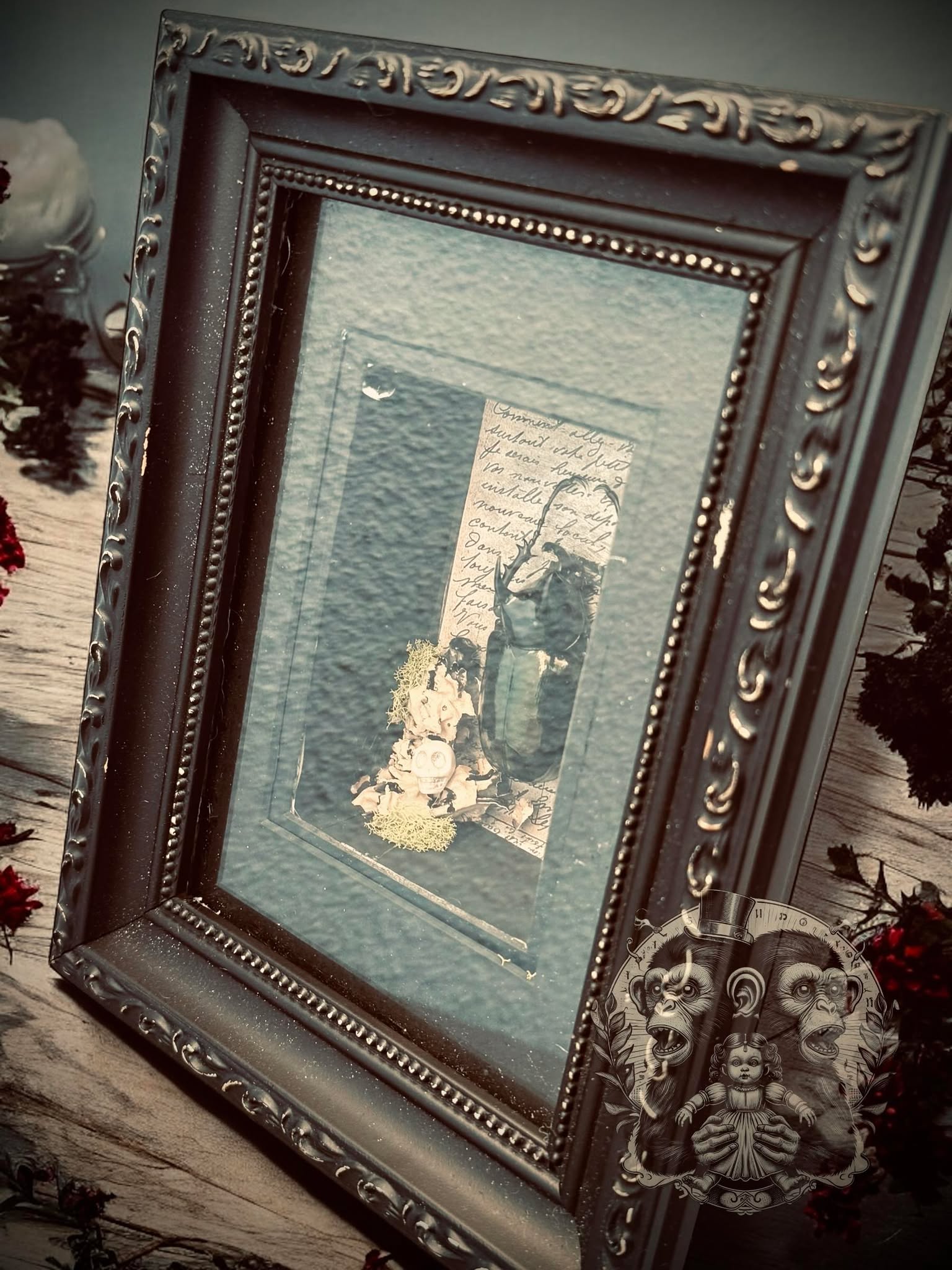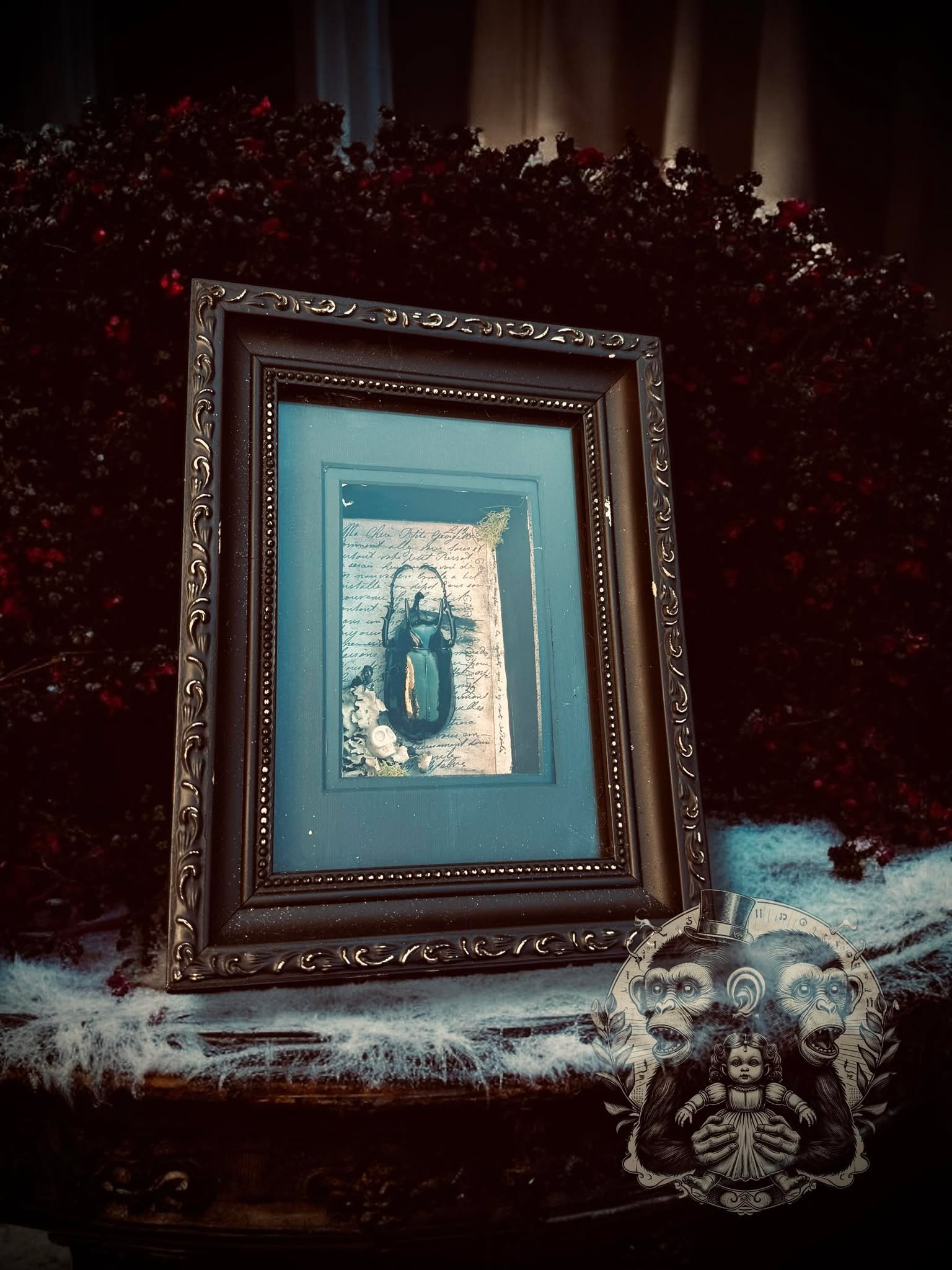 This one-of-a-kind shadow box features a real Atlas Beetle, charming faux moss, all set against an eerie backdrop.