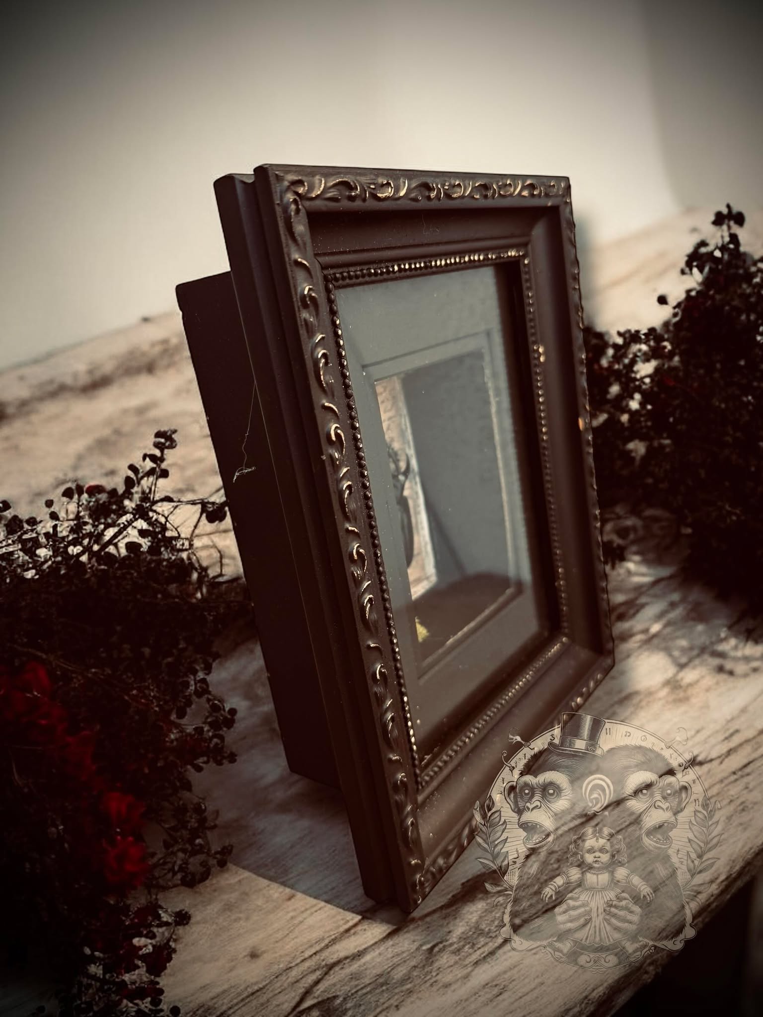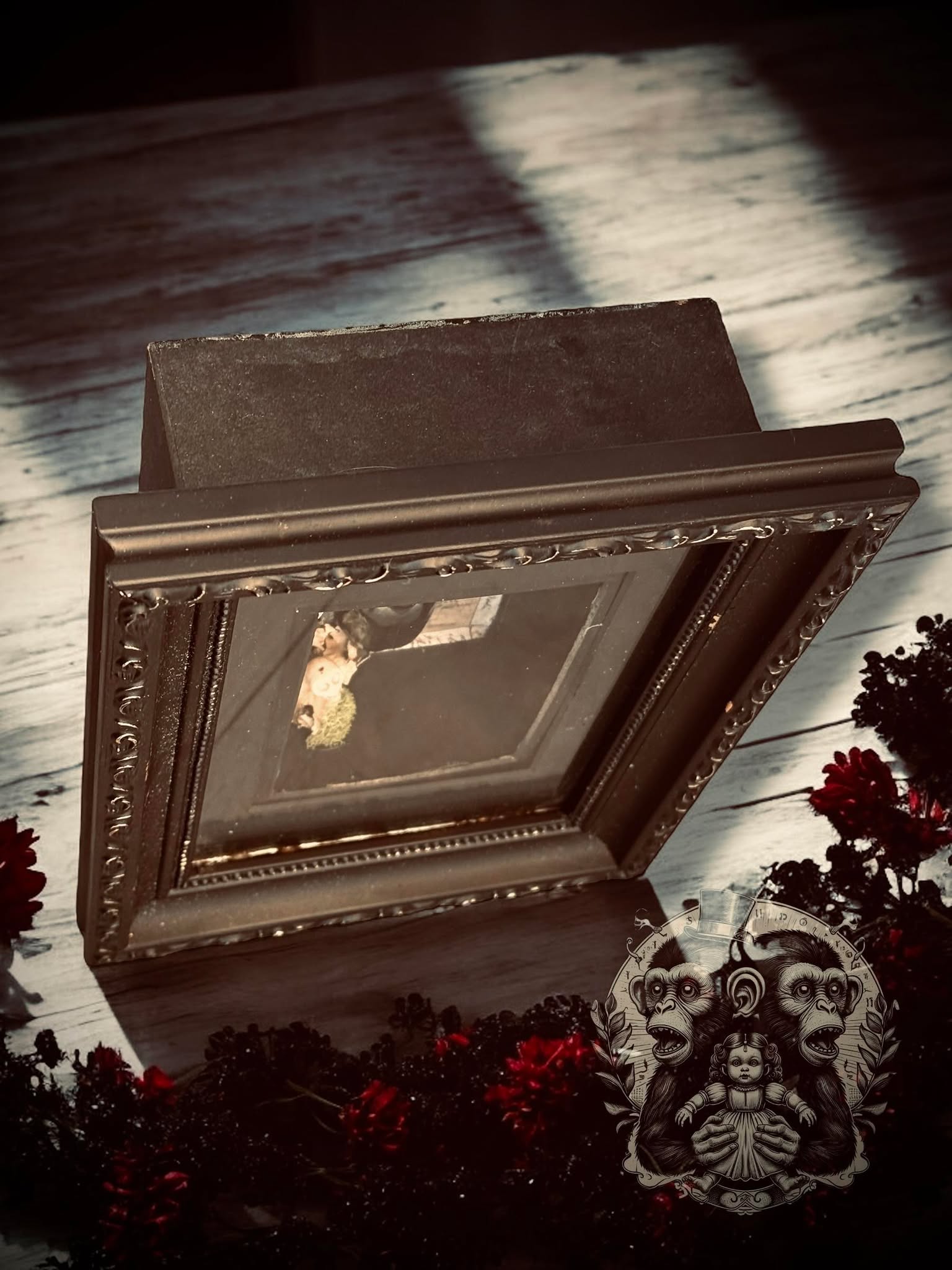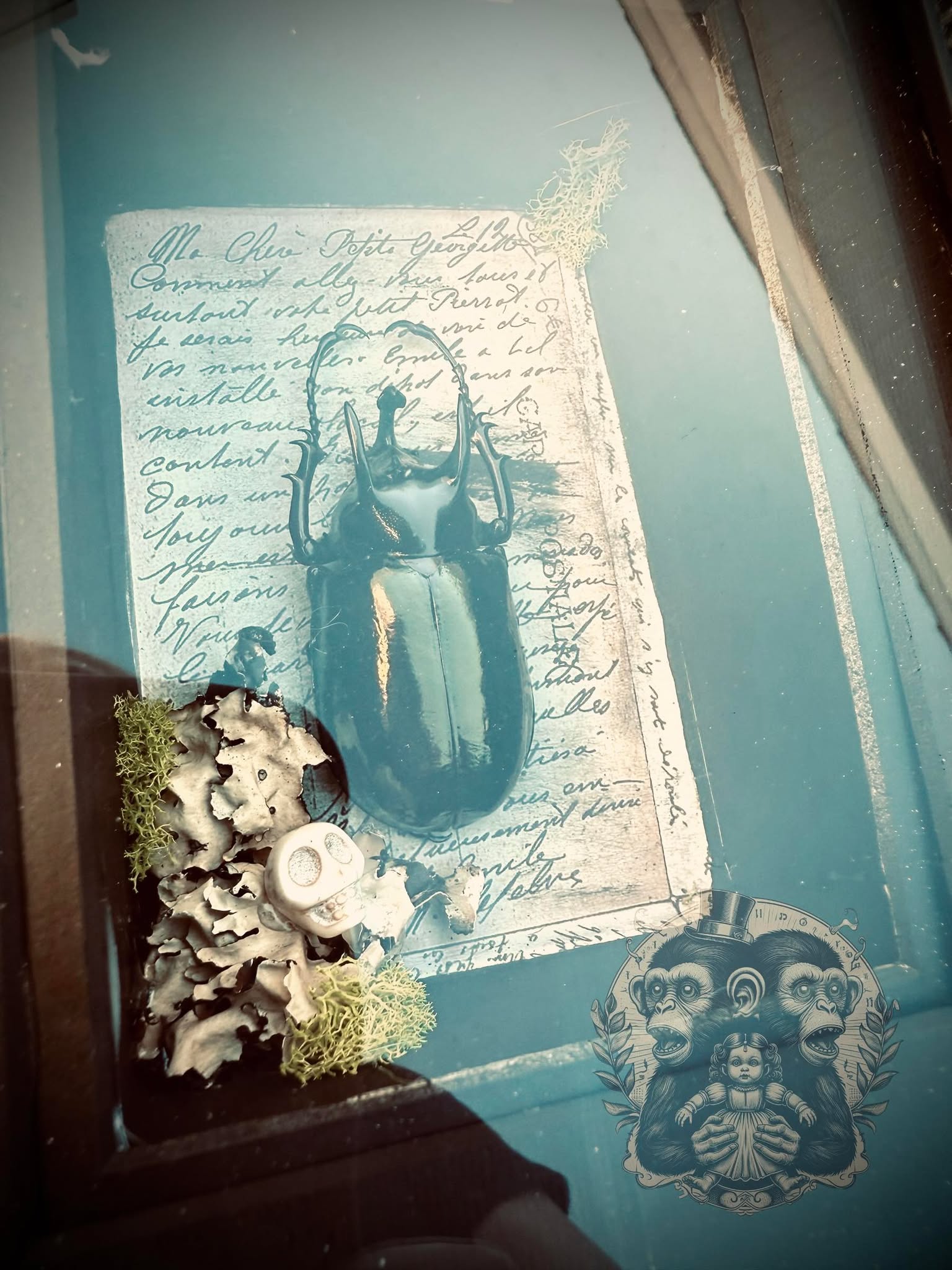 This one-of-a-kind shadow box features a real Atlas Beetle, charming faux moss, all set against an eerie backdrop.