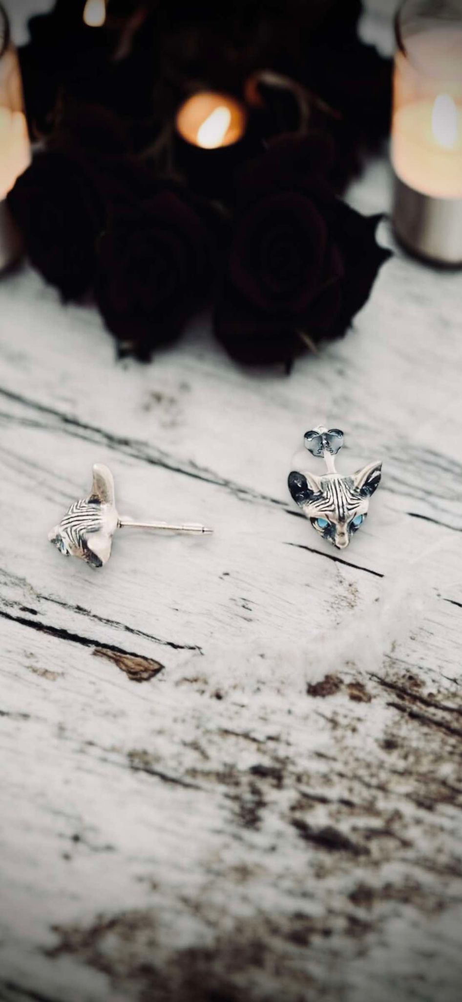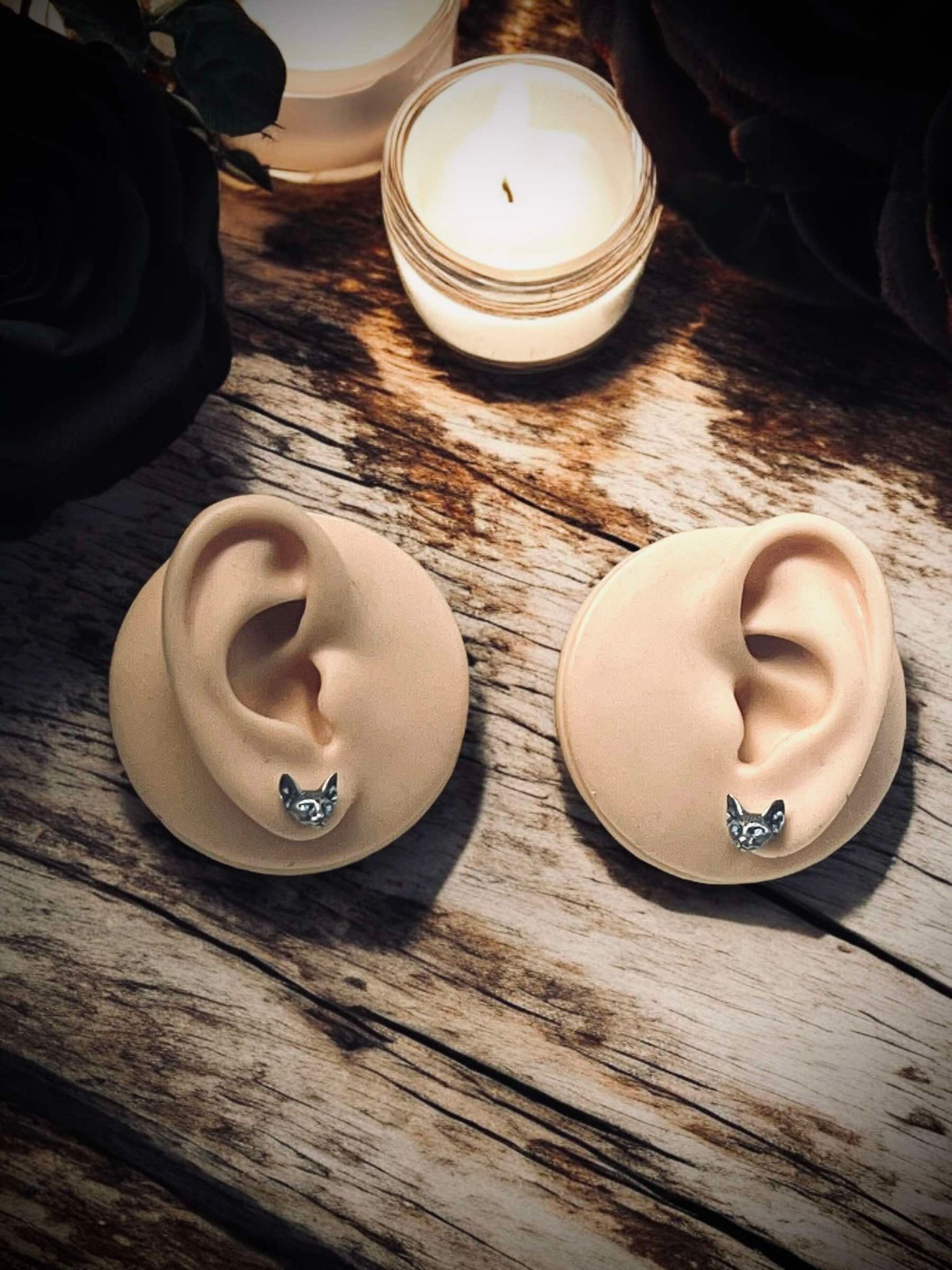 Cat's Head Post Earrings Blue Eyes Stud Sterling Silver Post Halloween Gift Ideas Rock Style Oddity Edgy Alternative Emo Costume Witch