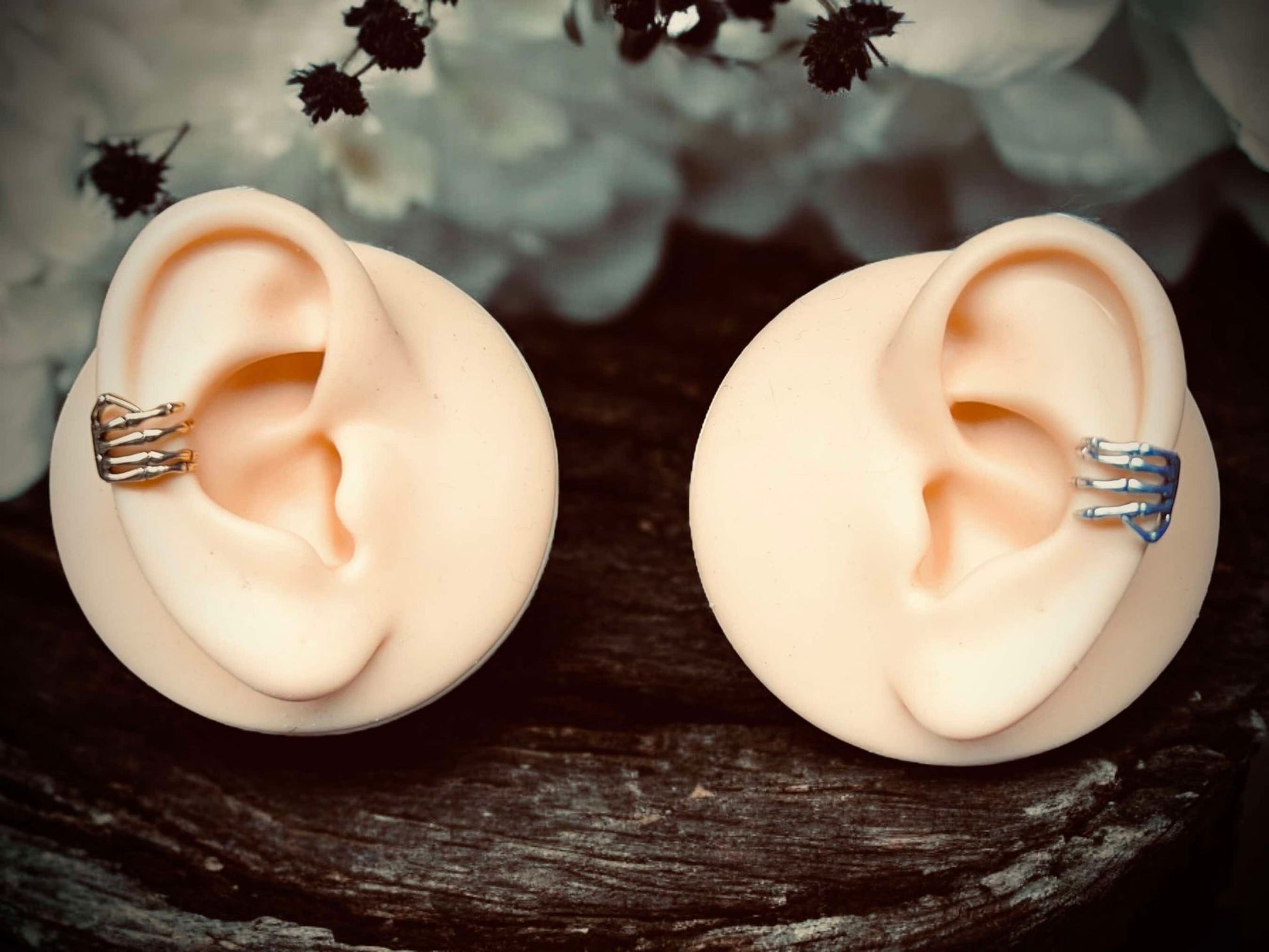 This ear cuff clip is perfect for those looking to add a touch of edginess to their Halloween costume. available in either gold or silver, it features a skeleton hand design and requires no piercings. This unique accessory is perfect for those who love alternative rock or have an emo style. It's also a great gift idea for any witch or punk rock enthusiast.