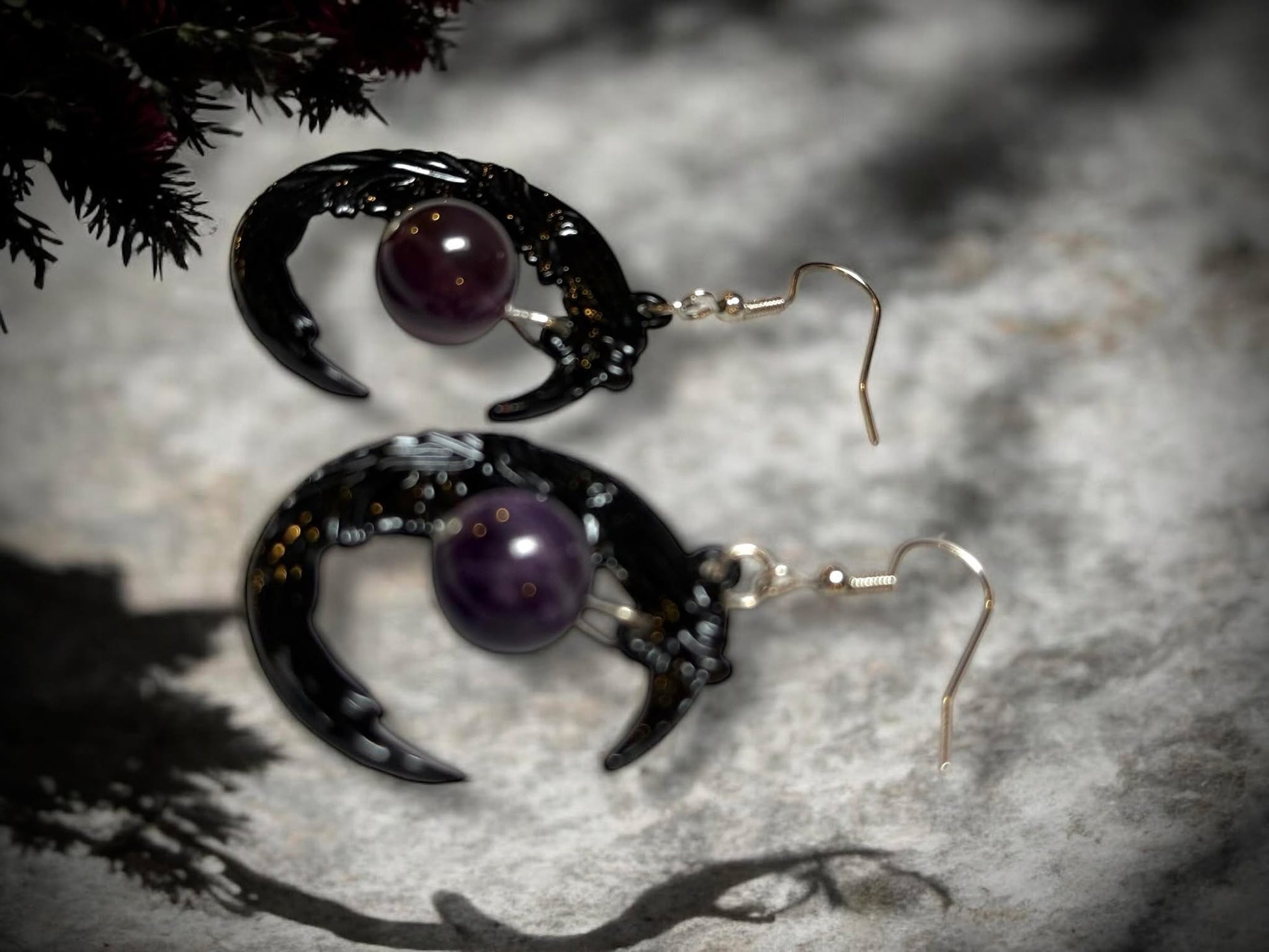 Gothic Black Crescent Purple Jewel Dangle Earrings, Punk Rock, Witchy Halloween Gift Idea Oddity Jewelry Cosplay Dress Up Metaphysical