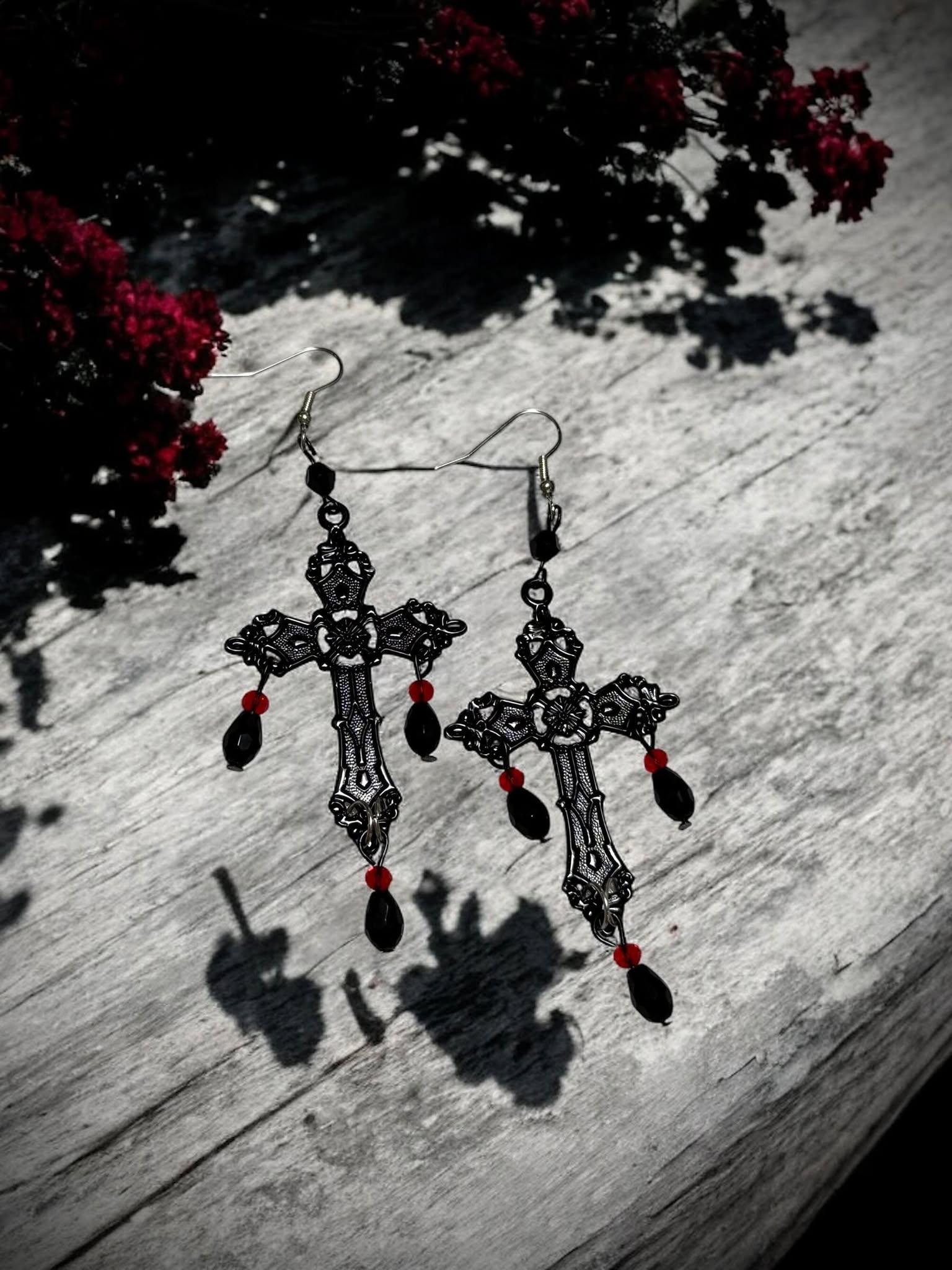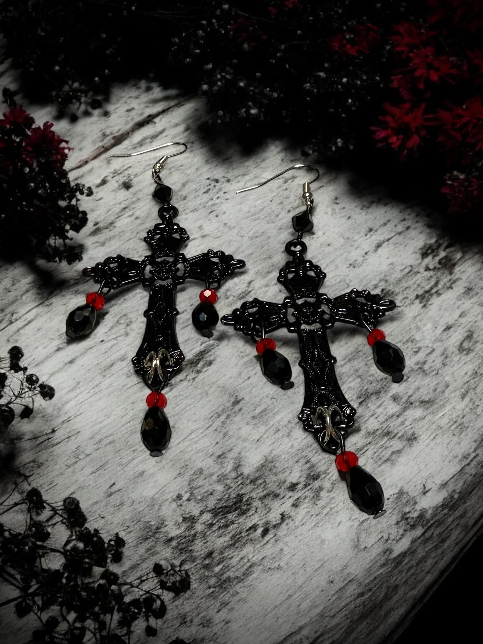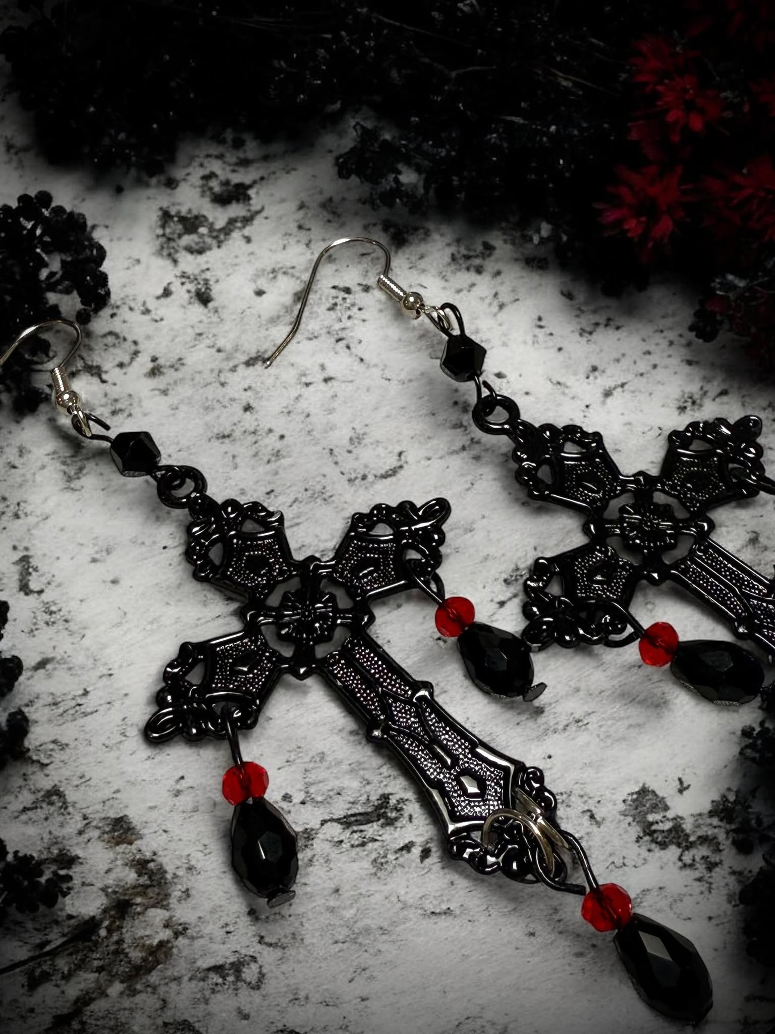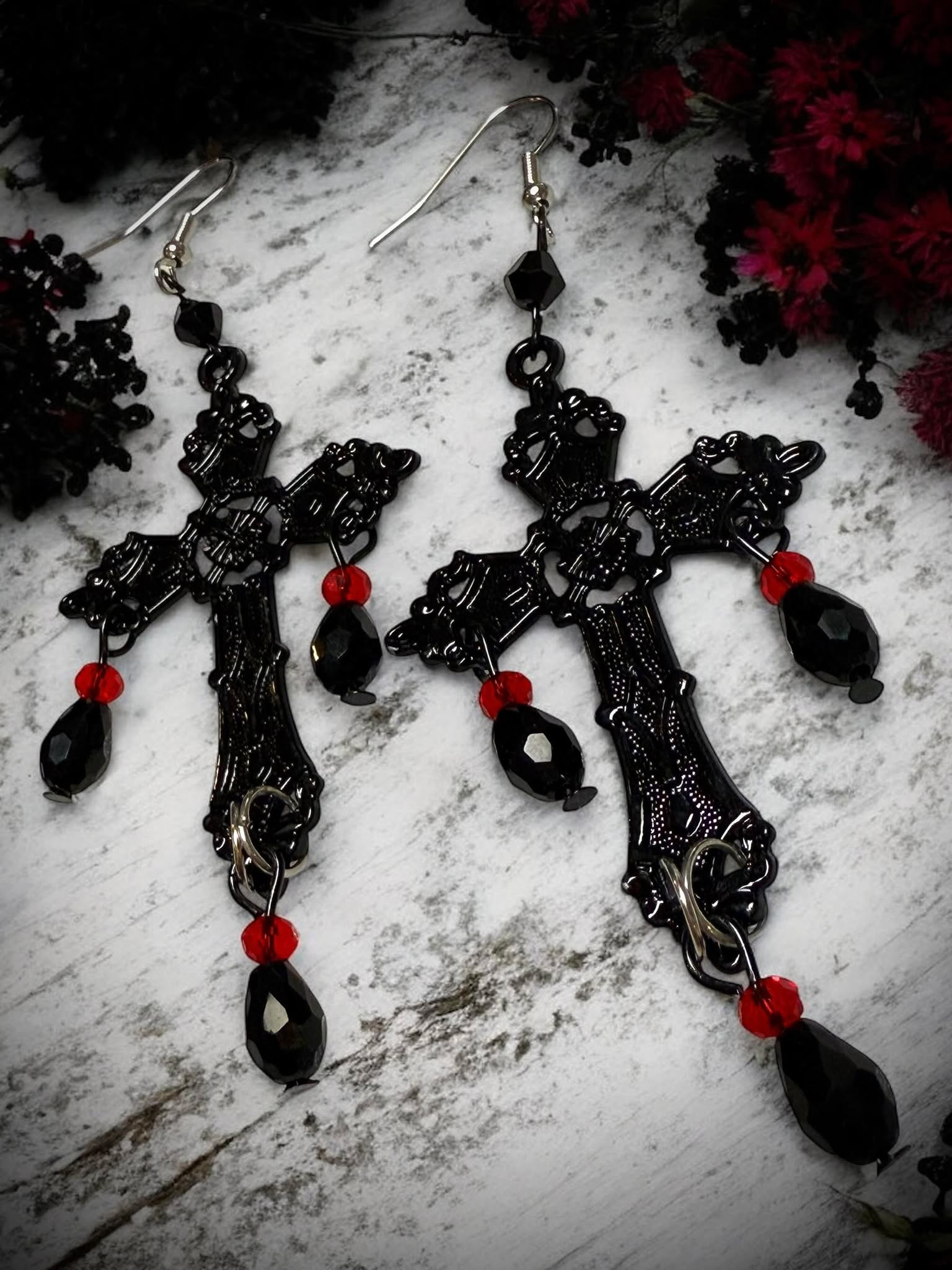 Gothic Black Cross Red Jeweled Earrings Dangle Earrings, Punk Rock, Witchy Halloween Gift Idea Oddity Jewelry Cosplay Dress Up #619