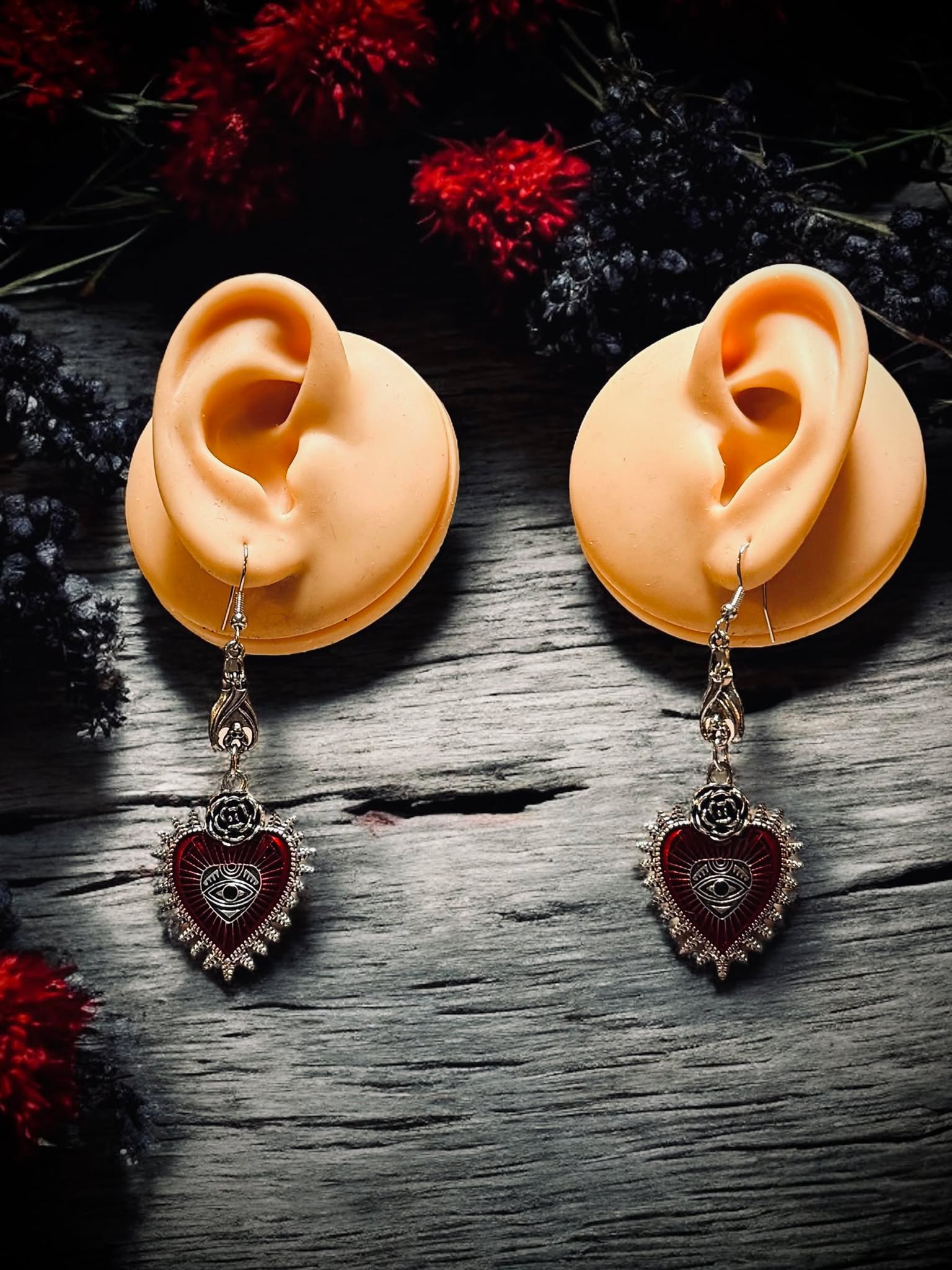 Gothic Red Heart Shaped Rose Bat Silver Dangle Earrings, Punk Rock, Witchy Halloween Gift Idea Oddity Jewelry Cosplay Dress Up Long Hanging