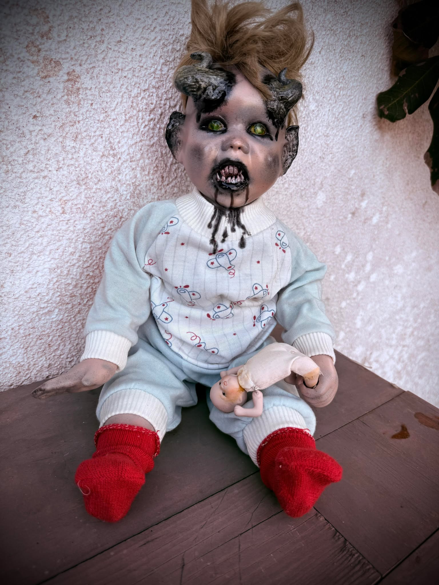 Looking for a one-of-a-kind gift? Check out Meet Astrid, the 17" porcelain doll who reigns over the supernatural realm with his creepy charm and positive oddity! Don't worry, he won't haunt your home (unless you want him to!). This doll is a must-have for all lovers of the occult and the paranormal. Plus, with his horns and possessed spirit, he's sure to add a unique touch to any collection. Get him now before he disappears (into thin air)!