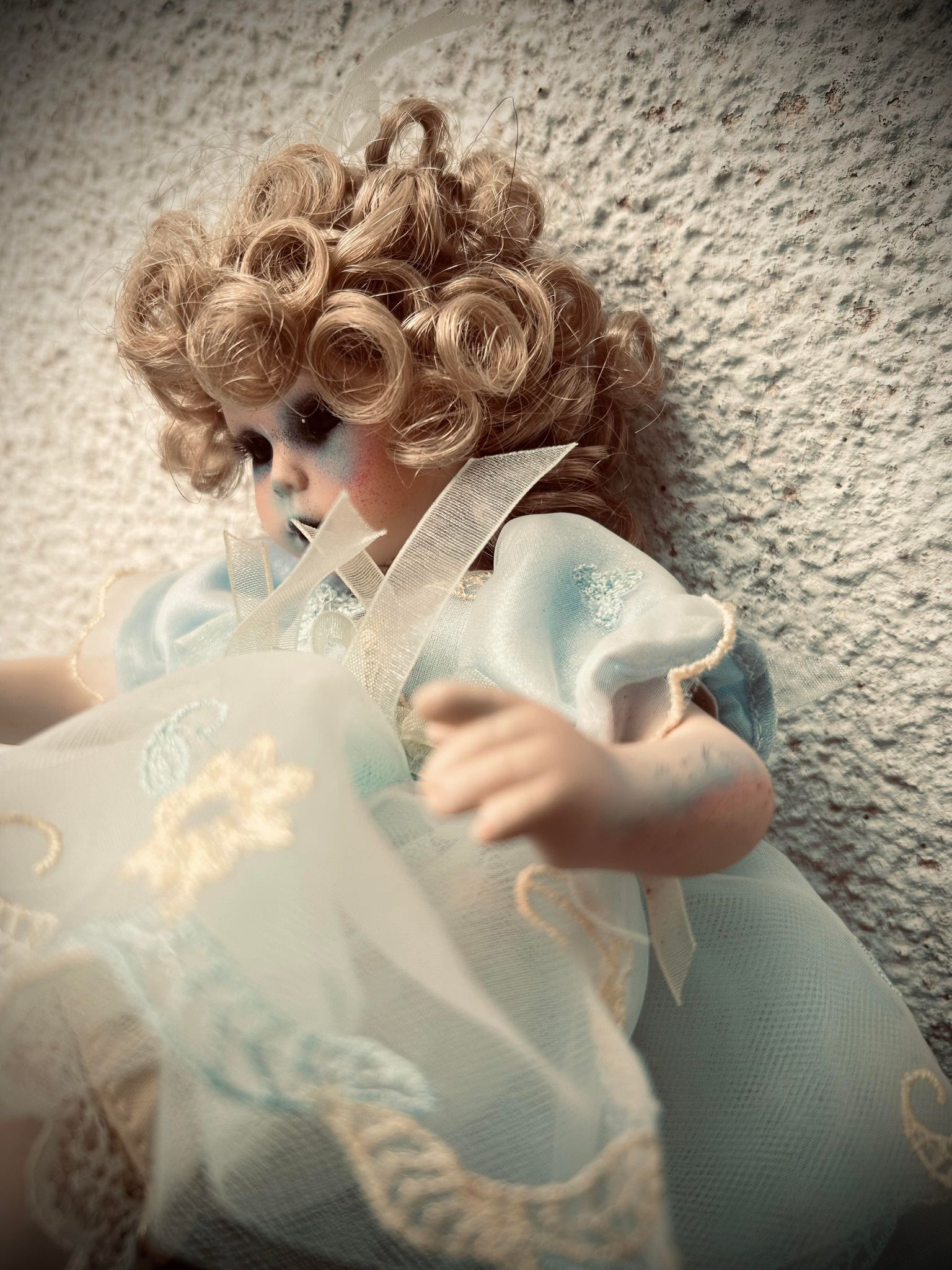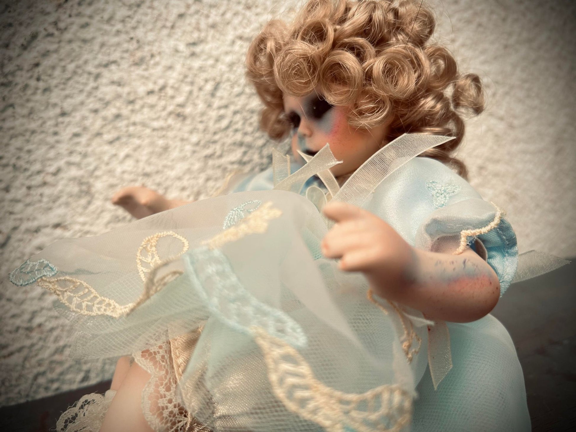 Take home this haunted host, crafted from a second-hand doll of a porcelain head, hands and legs with a stuffed body. They may have their fair share of "flaws," but that's part of their charmingly spooky story! (But, no promises on perfect condition here!)