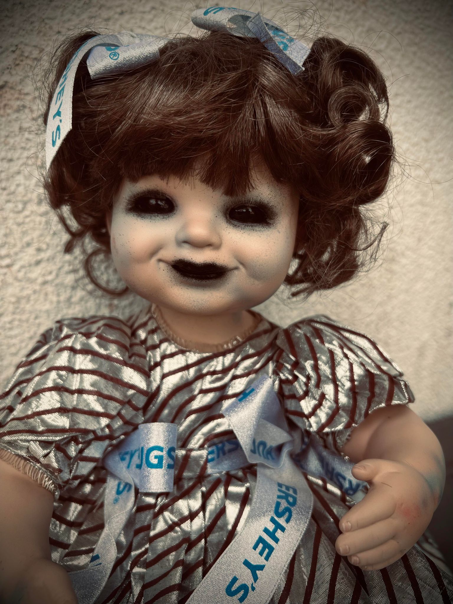 Take home this haunted host, crafted from a second-hand doll of porcelain head, hands and feet with a stuffed body. They may have their fair share of "flaws," but that's part of their charmingly spooky story! (But, no promises on perfect condition here!)