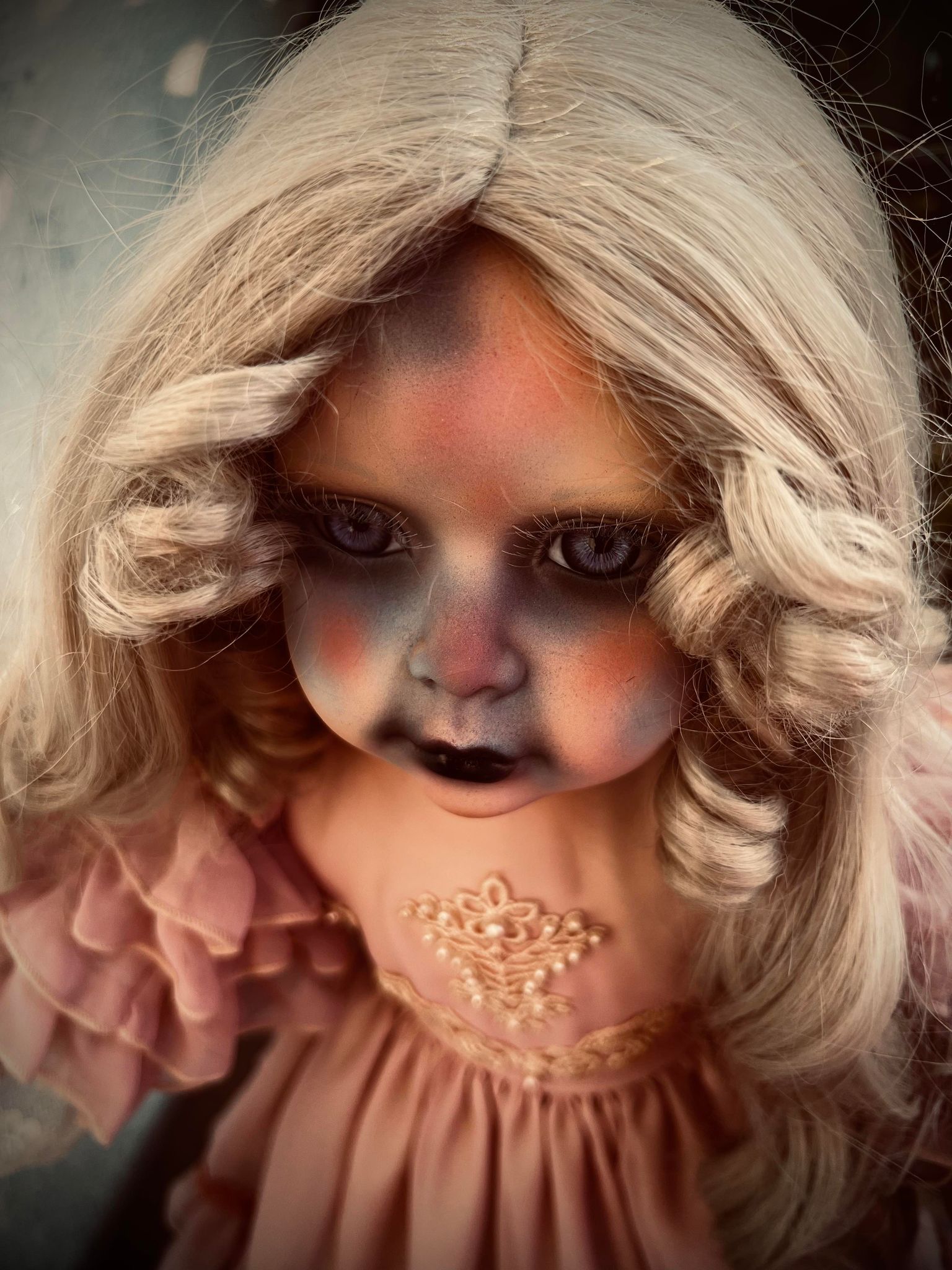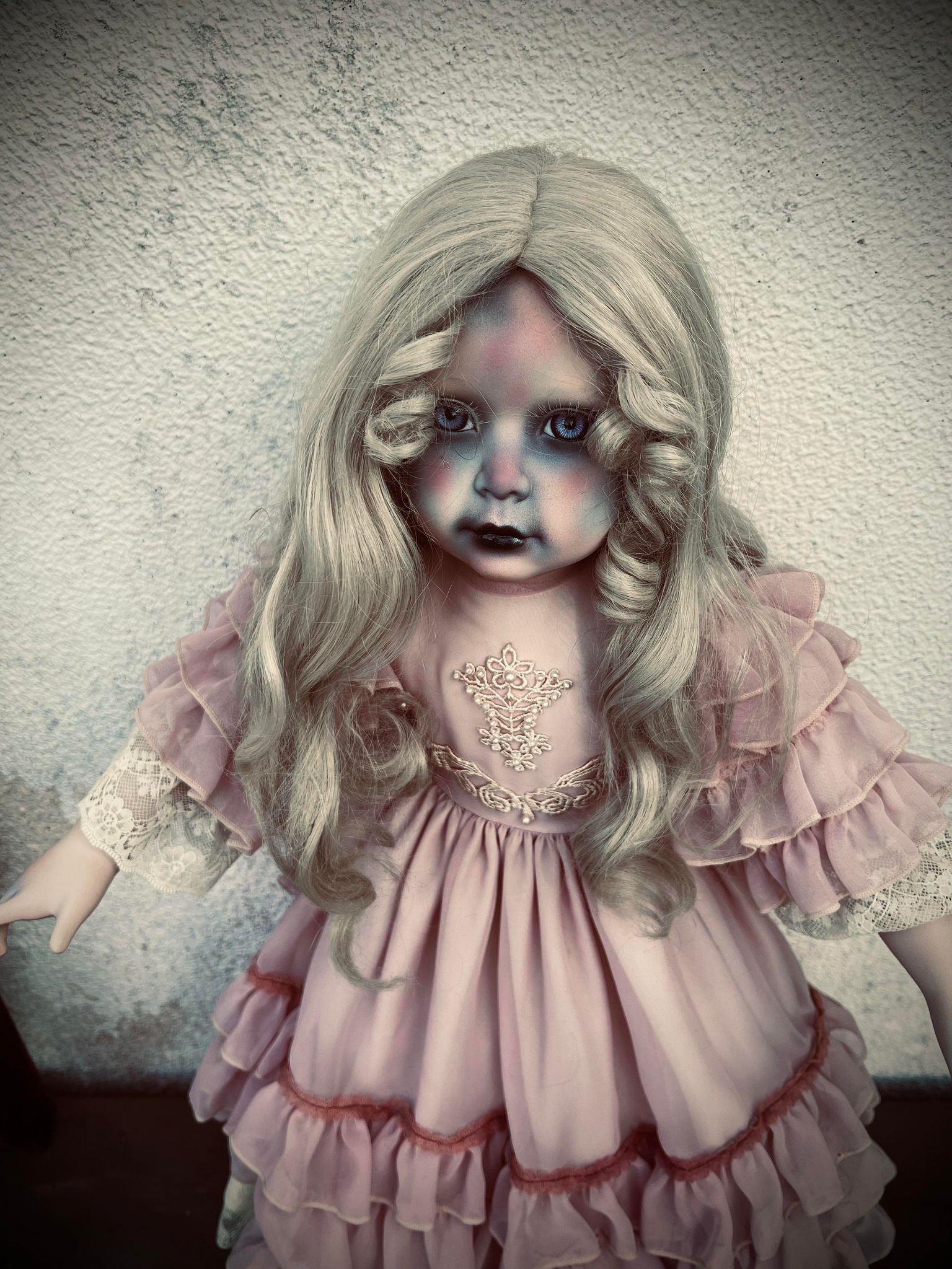 Discover the enchanting Lucinda, a large porcelain doll that exudes a haunting and bewitching presence. With an undead, zombie-like appearance, this doll is a unique and eerie addition to any collection. Infected with a mysterious spirit and possessing an otherworldly aura, Lucinda is a one-of-a-kind gift idea for those seeking a touch of the odd and spooky.
