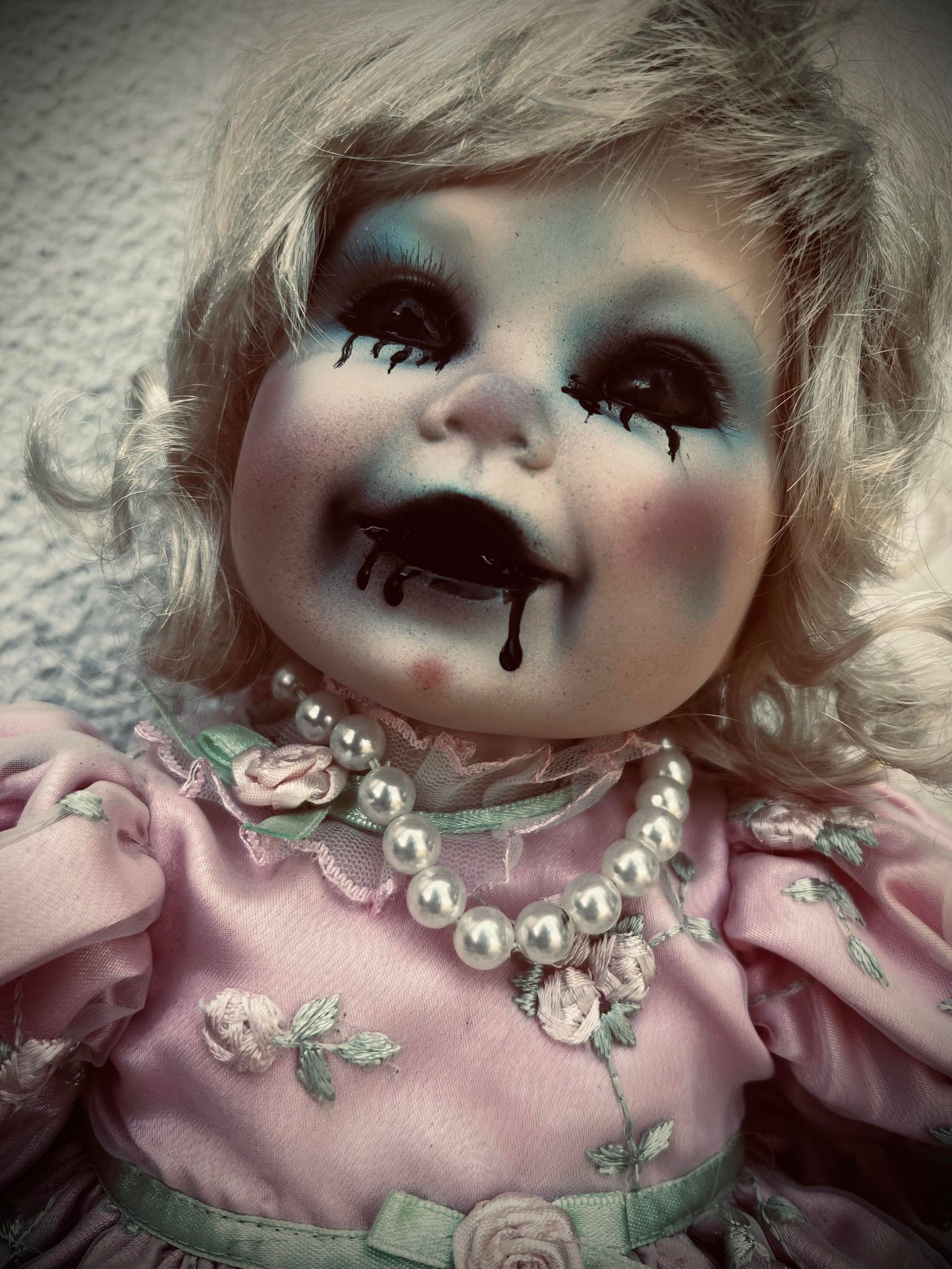 Take home this haunted host, crafted from a second-hand doll of porcelain head, hands and feet with a stuffed body. They may have their fair share of "flaws," but that's part of their charmingly spooky story! (But, no promises on perfect condition here!)