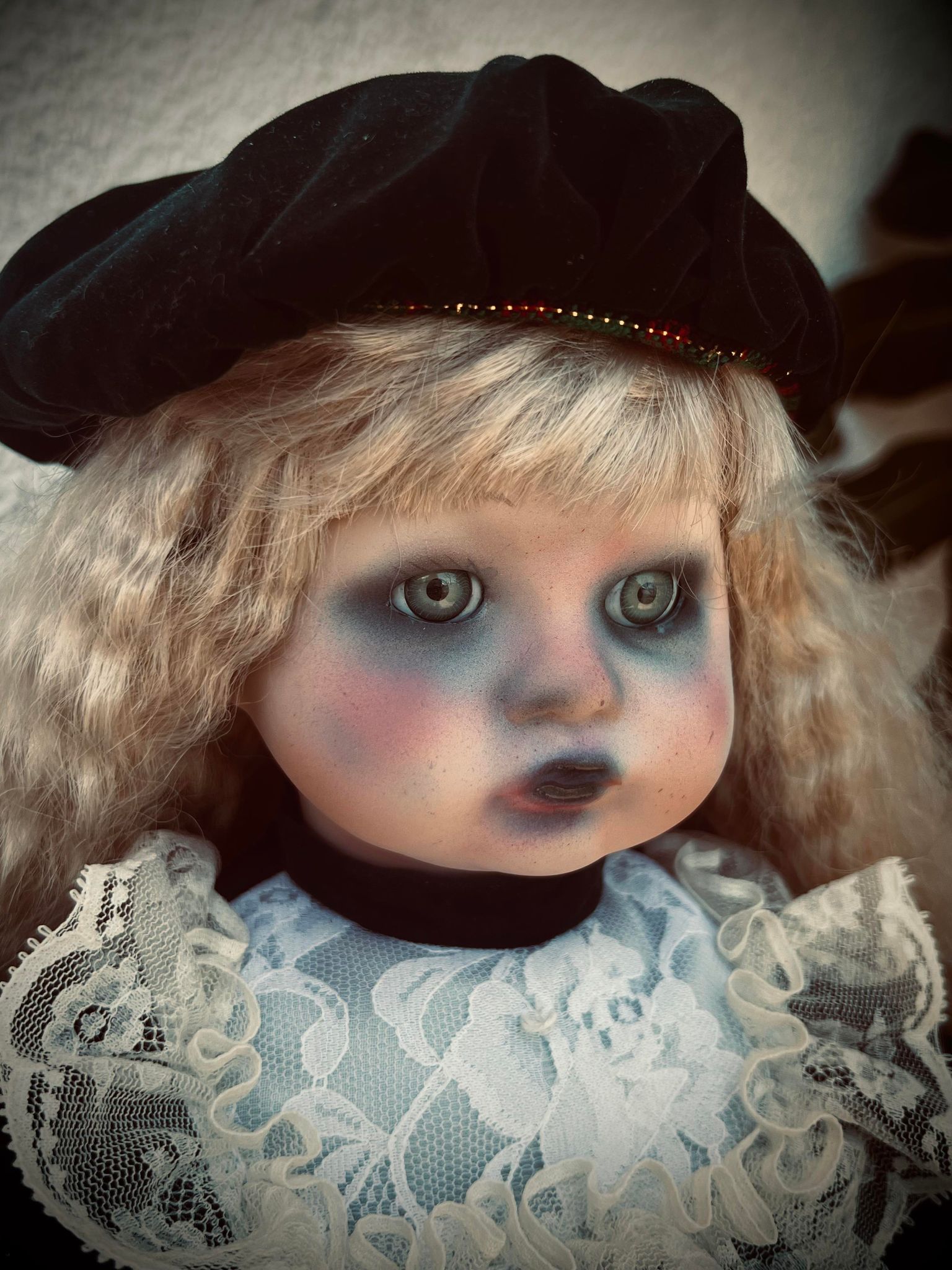 Take home this haunted host, crafted from a second-hand doll of porcelain head, hands and feet with a stuffed body. They may have their fair share of "flaws," but that's part of their charmingly spooky story! (But, no promises on perfect condition here!)
