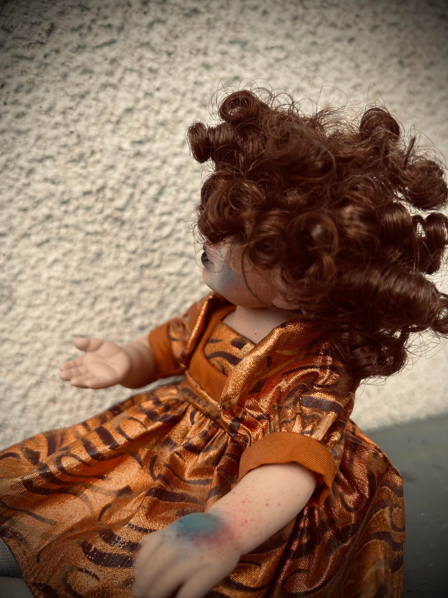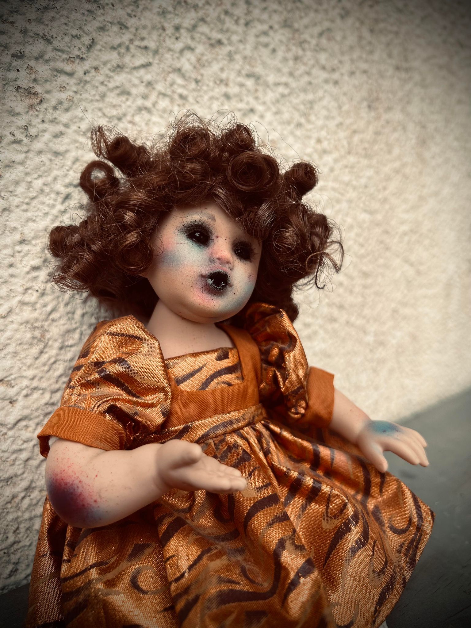 Take home this haunted host, crafted from a second-hand doll of a porcelain head, hands and legs with a stuffed body. They may have their fair share of "flaws," but that's part of their charmingly spooky story! (But, no promises on perfect condition here!)
