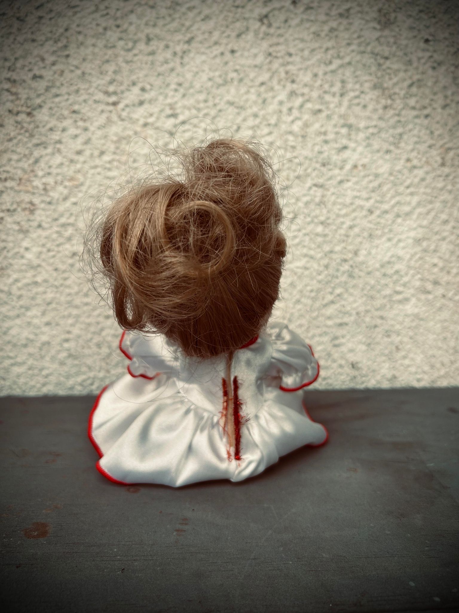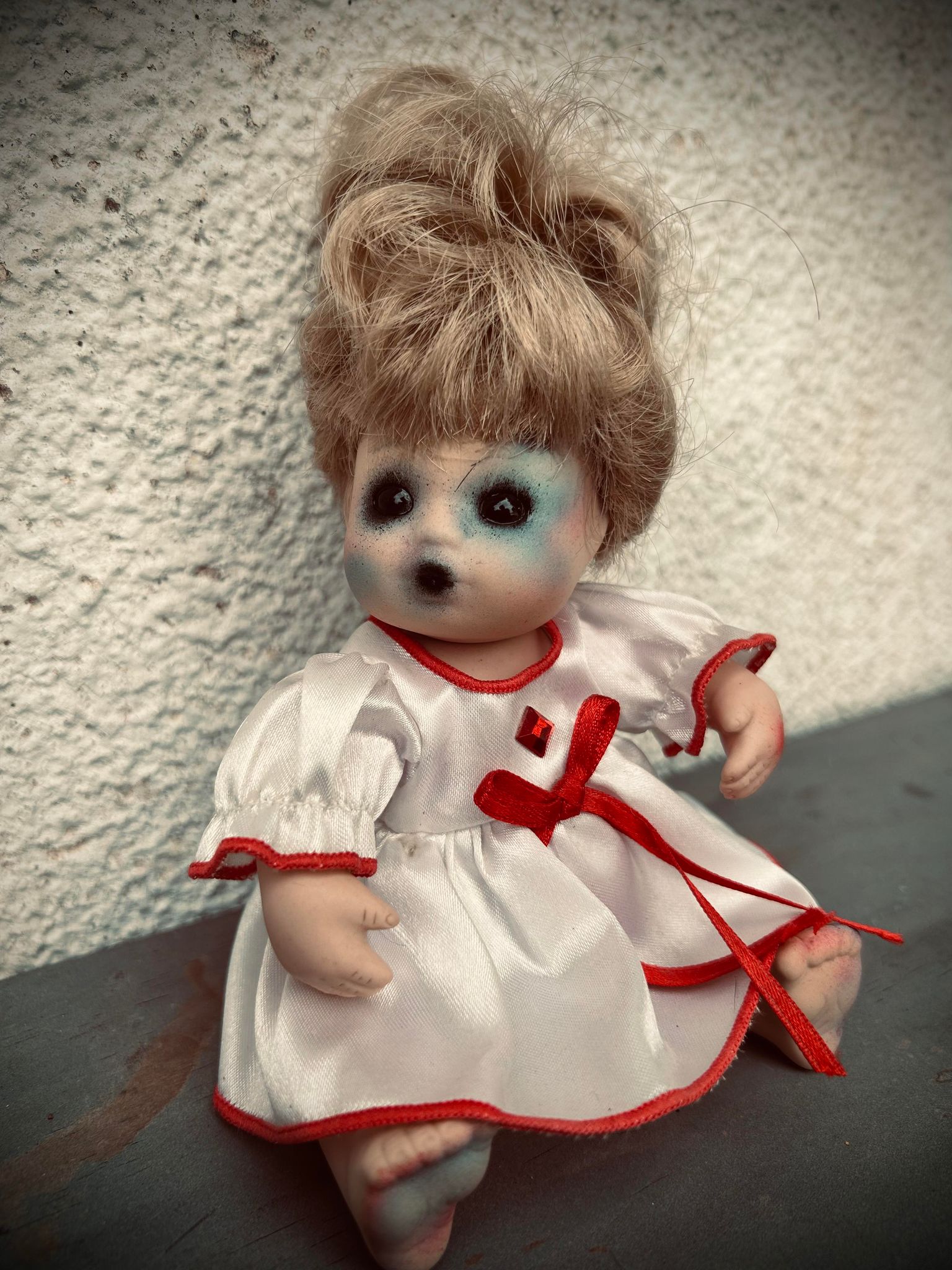 Take home this haunted host, crafted from a second-hand doll of a porcelain head, hands and legs with a stuffed body. They may have their fair share of "flaws," but that's part of their charmingly spooky story! (But, no promises on perfect condition here!)