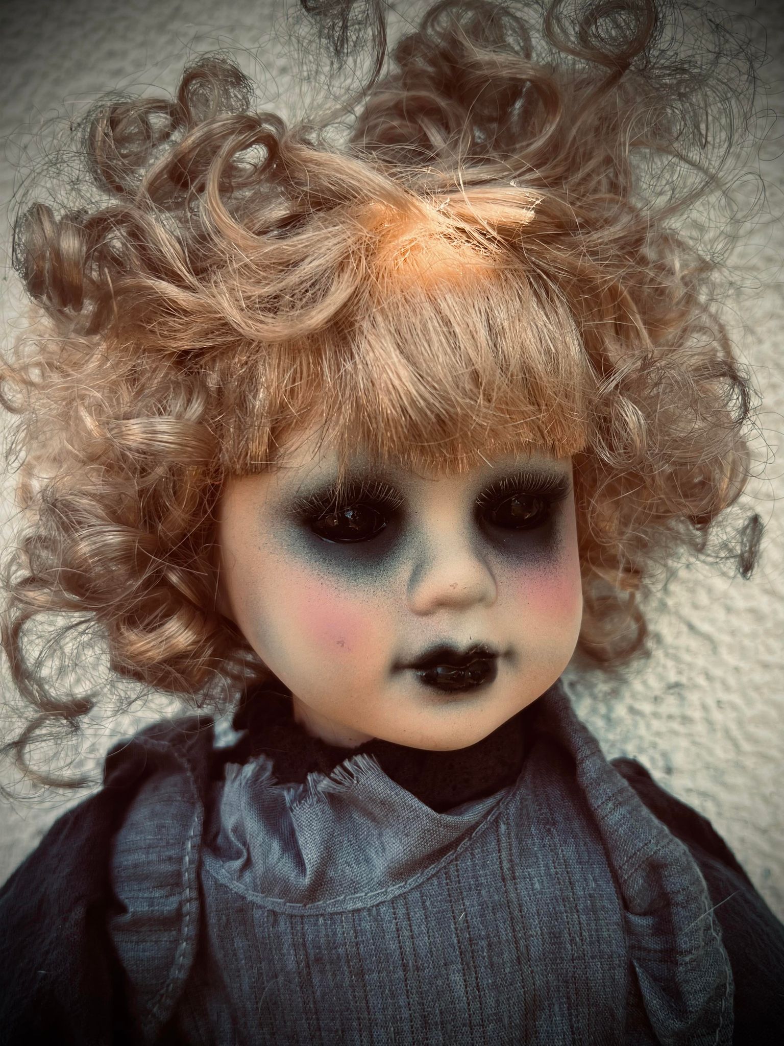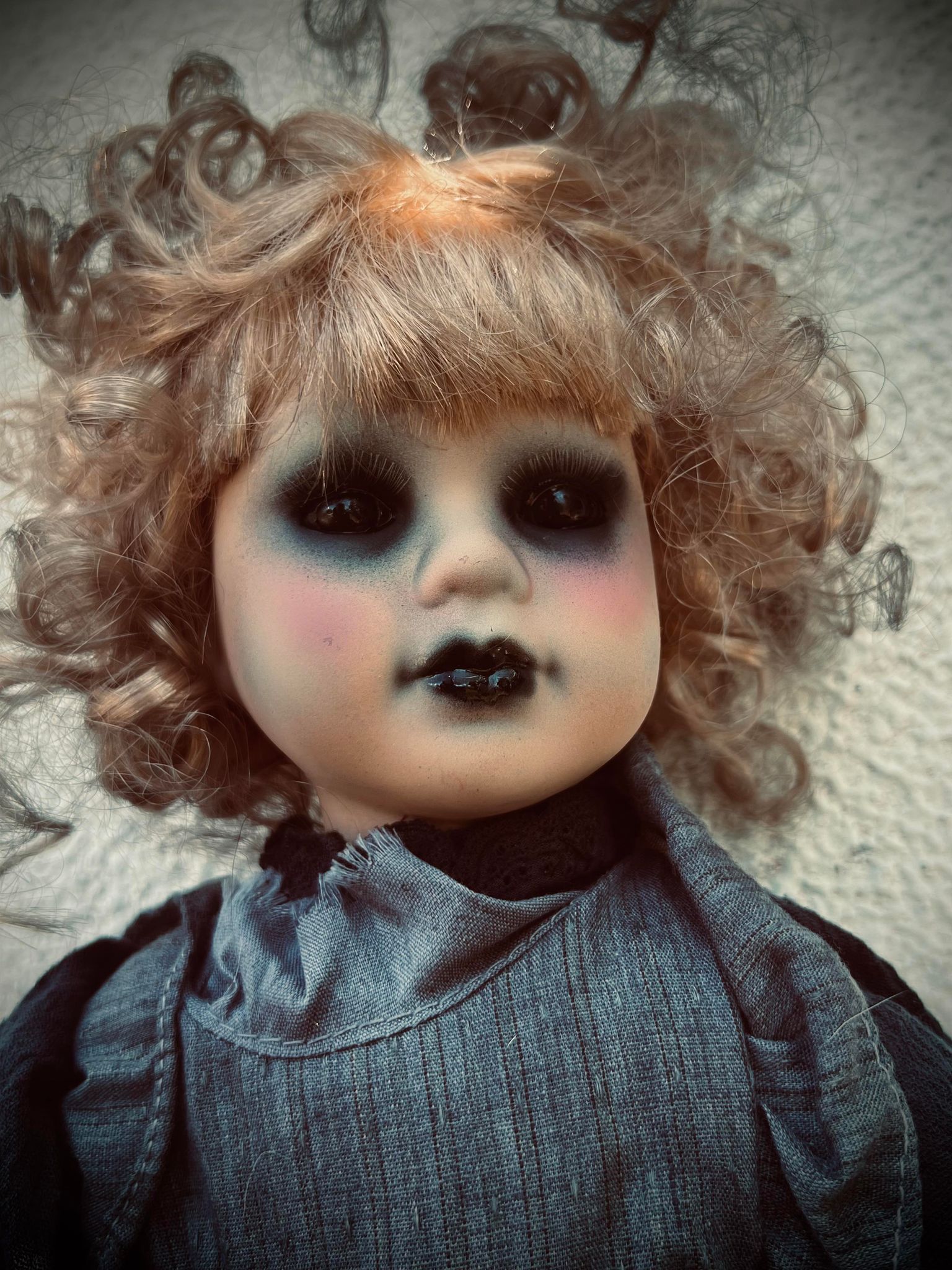 Take home this haunted host, crafted from a second-hand doll of porcelain head, hands and feet with a stuffed body. They may have their fair share of "flaws," but that's part of their charmingly spooky story! (But, no promises on perfect condition here!)