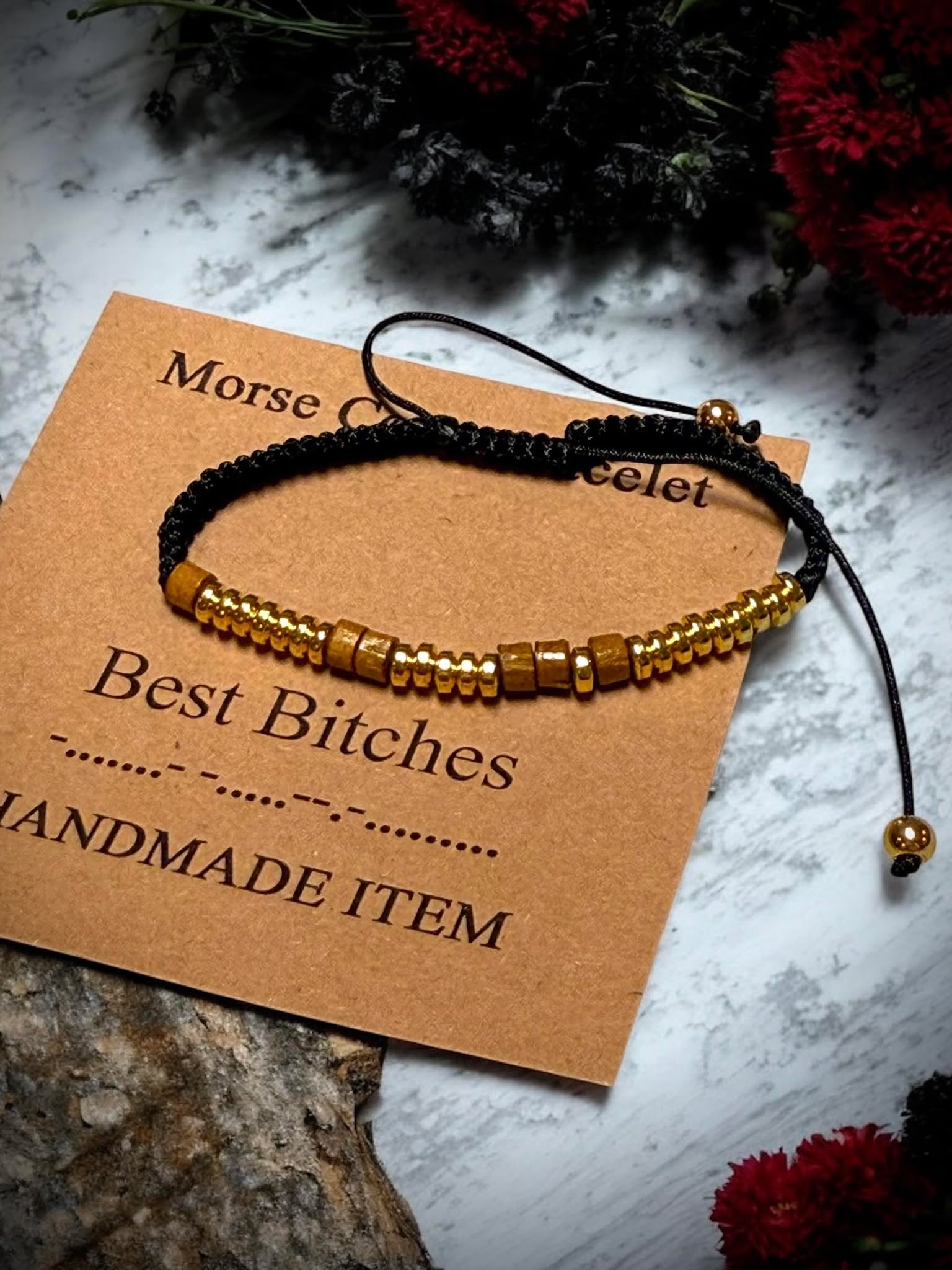 These handmade Bracelets feature wooden beads and golden spacers, with a unique Morse code design. Perfect for best friends, these bracelets have a circumference of approximately 6.69-7.08 inches and an adjustable extension of 2.75-3.15 inches. (Oddity Jewelry, anyone?)