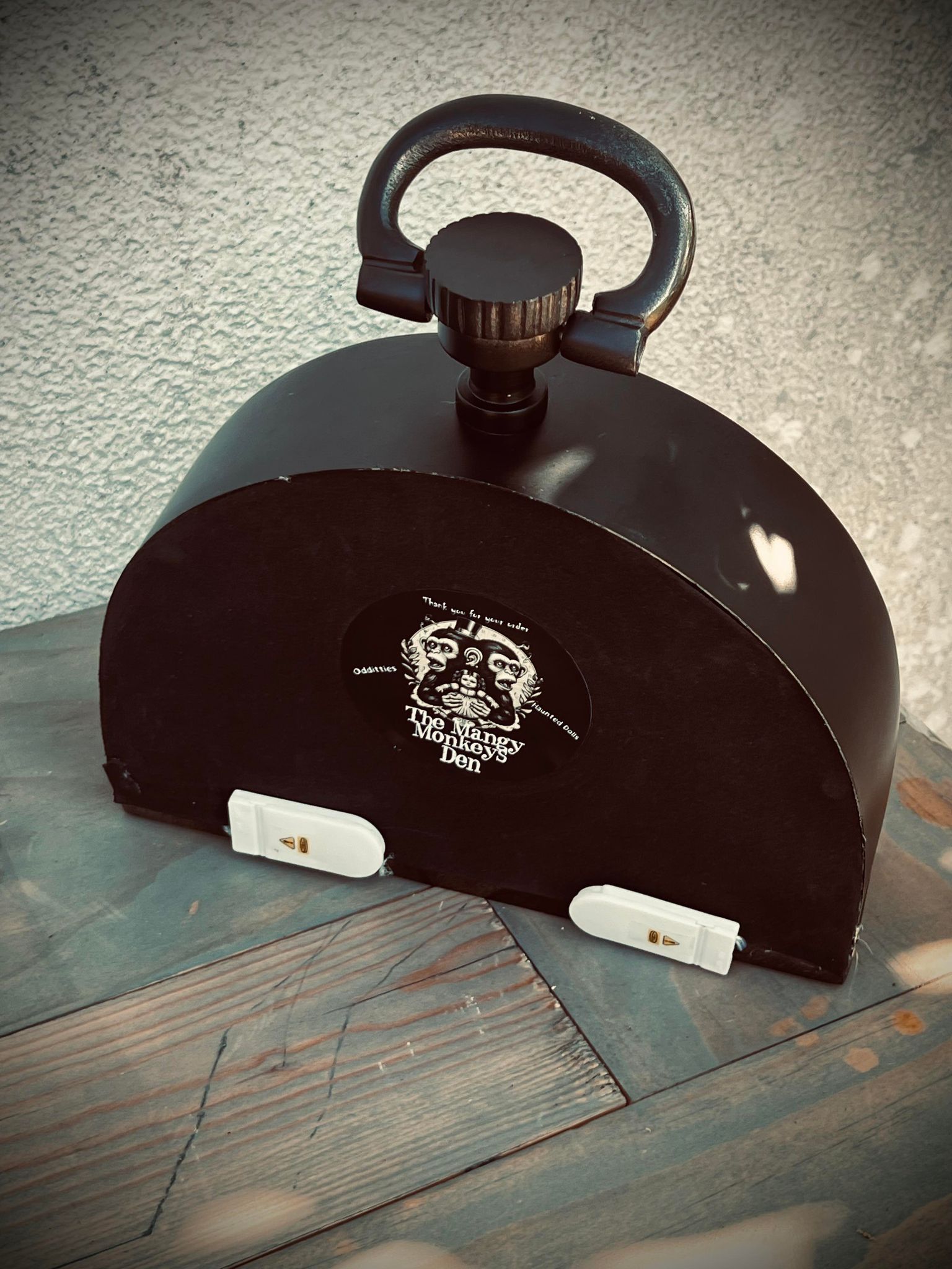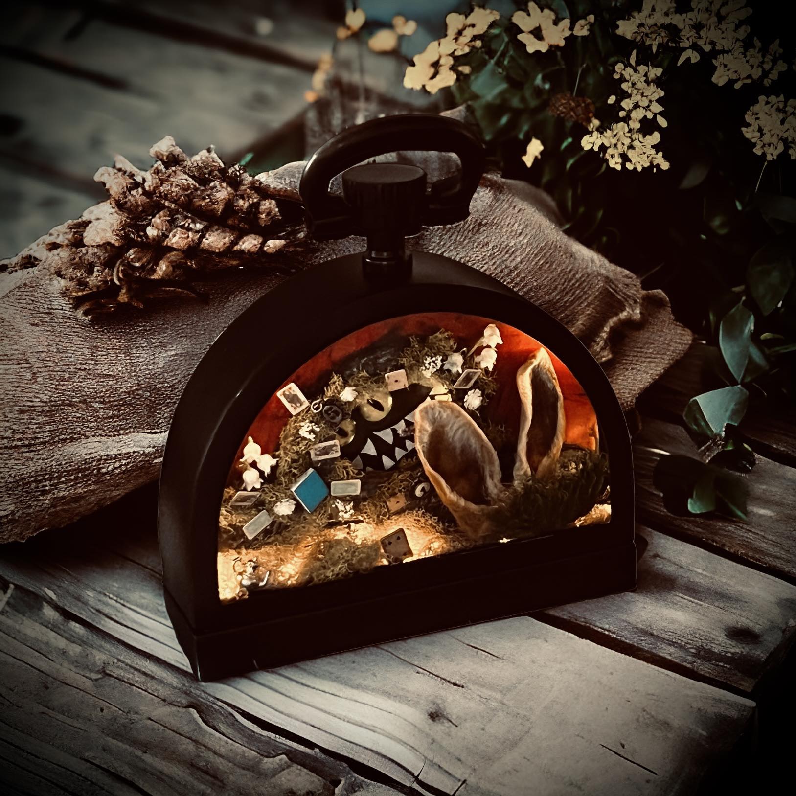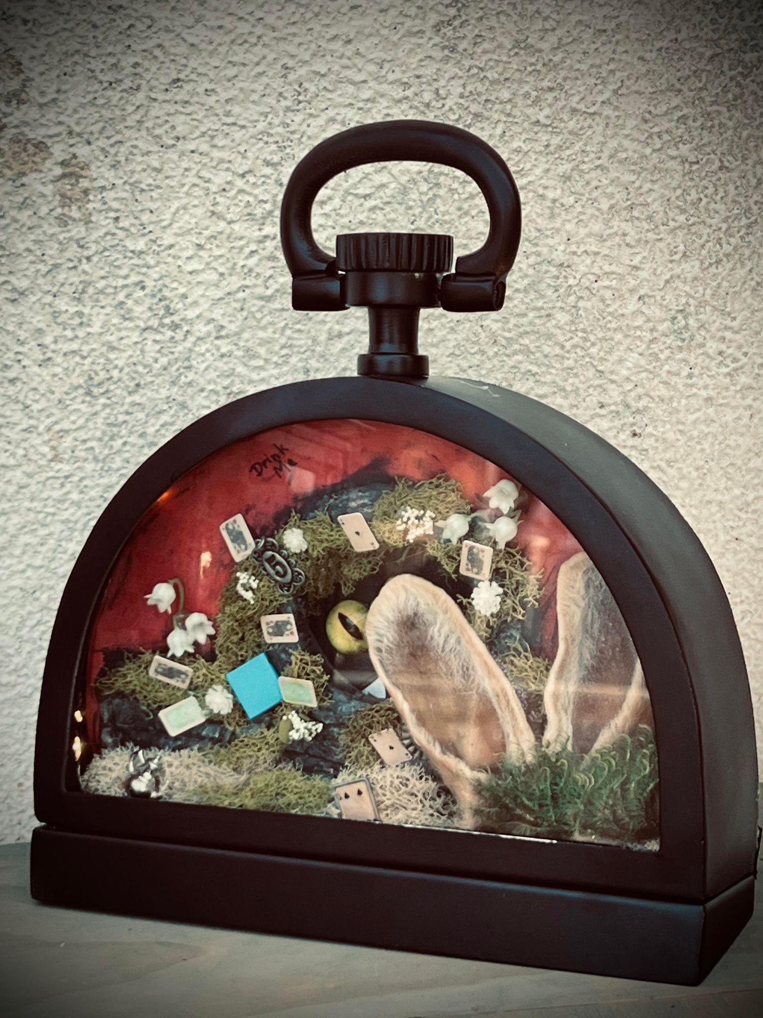 This display features an upcycled metal clock housing fairy lights with a battery pack for easy replacement. Adding some whimsy, artificial flowers, real bunny ears, charms and faux moss complete the inside. The metal and glass display also includes a metal handle.