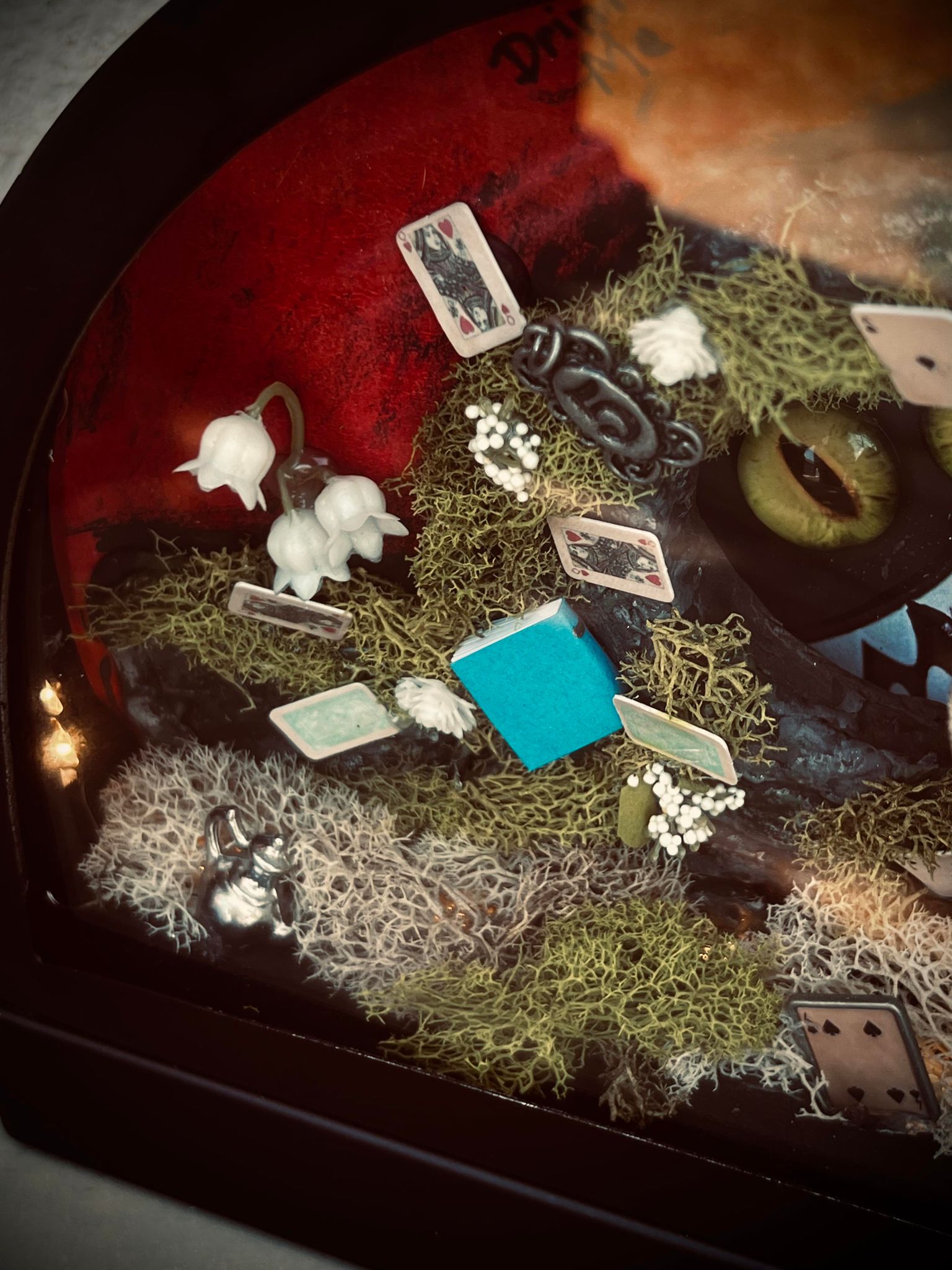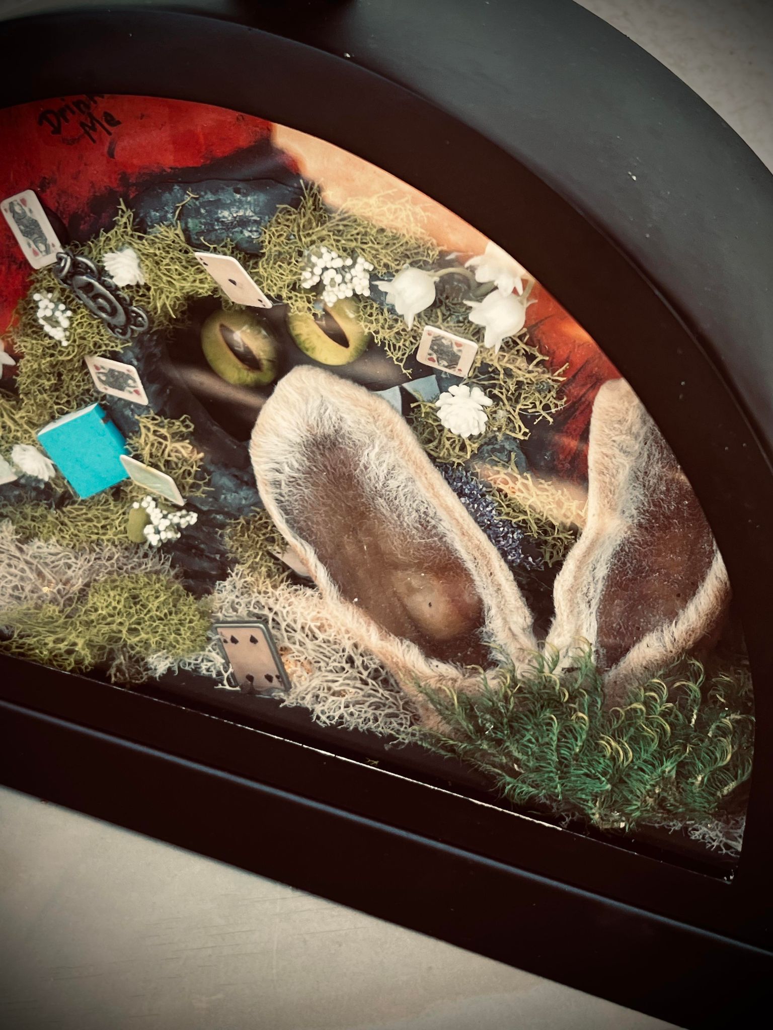 Our playful take on Alice In The Wonderland features real bunny ears, faux flowers, and even fairy lights to add a touch of magic to your space. This one-of-a-kind piece adds a fun, quirky twist to any room.