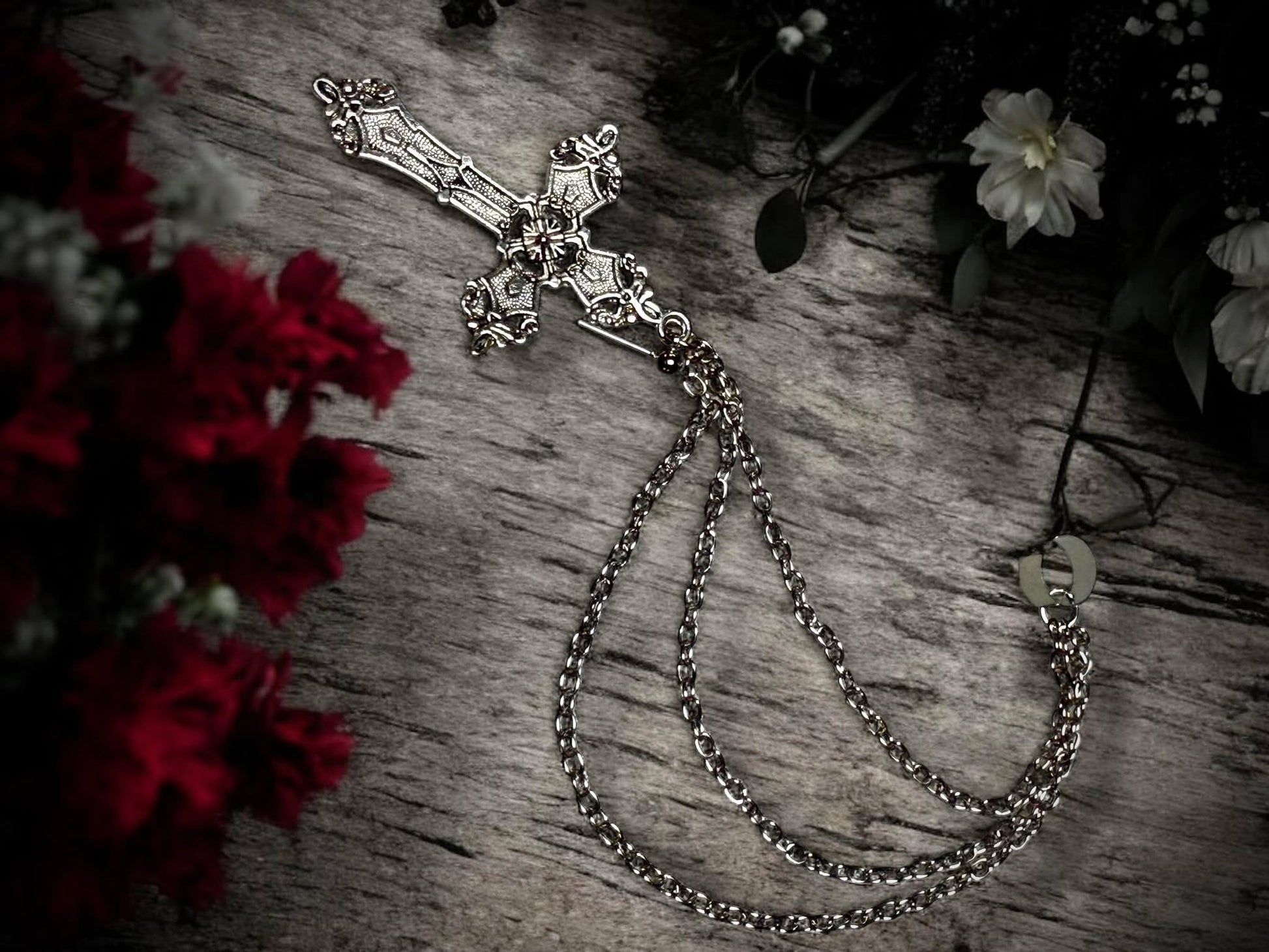 Silver Gothic Cross Earring with Dangling Chain Clip Cuff Punk Rock Steam Punk Religious Oddities Oddity Cosplay Dress Up Wiccan Vampire