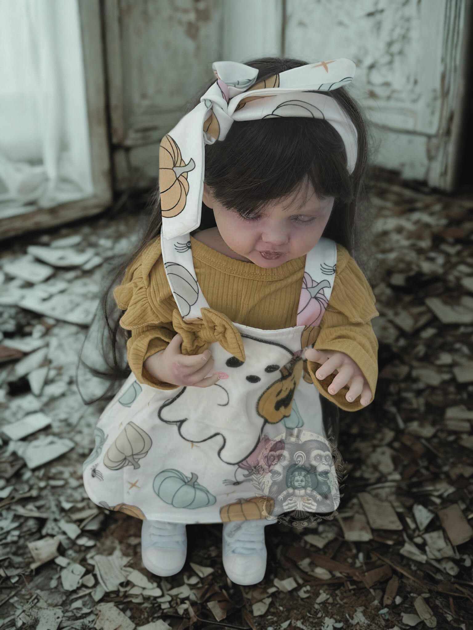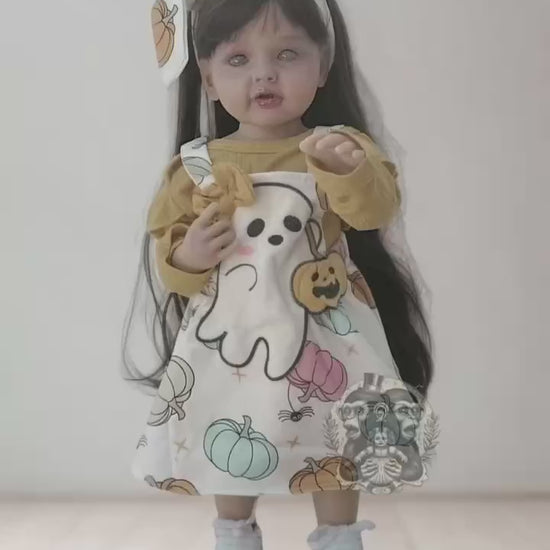 Years later, the doll appeared. No one could trace its origin, but it wore the very outfit Lila had vanished in — a sweet fall-themed dress patterned with tiny ghosts. Her long black hair, once silky, now drapes over her face in soft tangles. A small headband still holds it back, just enough to reveal her eyes — glazed over, glassy, and filled with the stillness of fresh death.