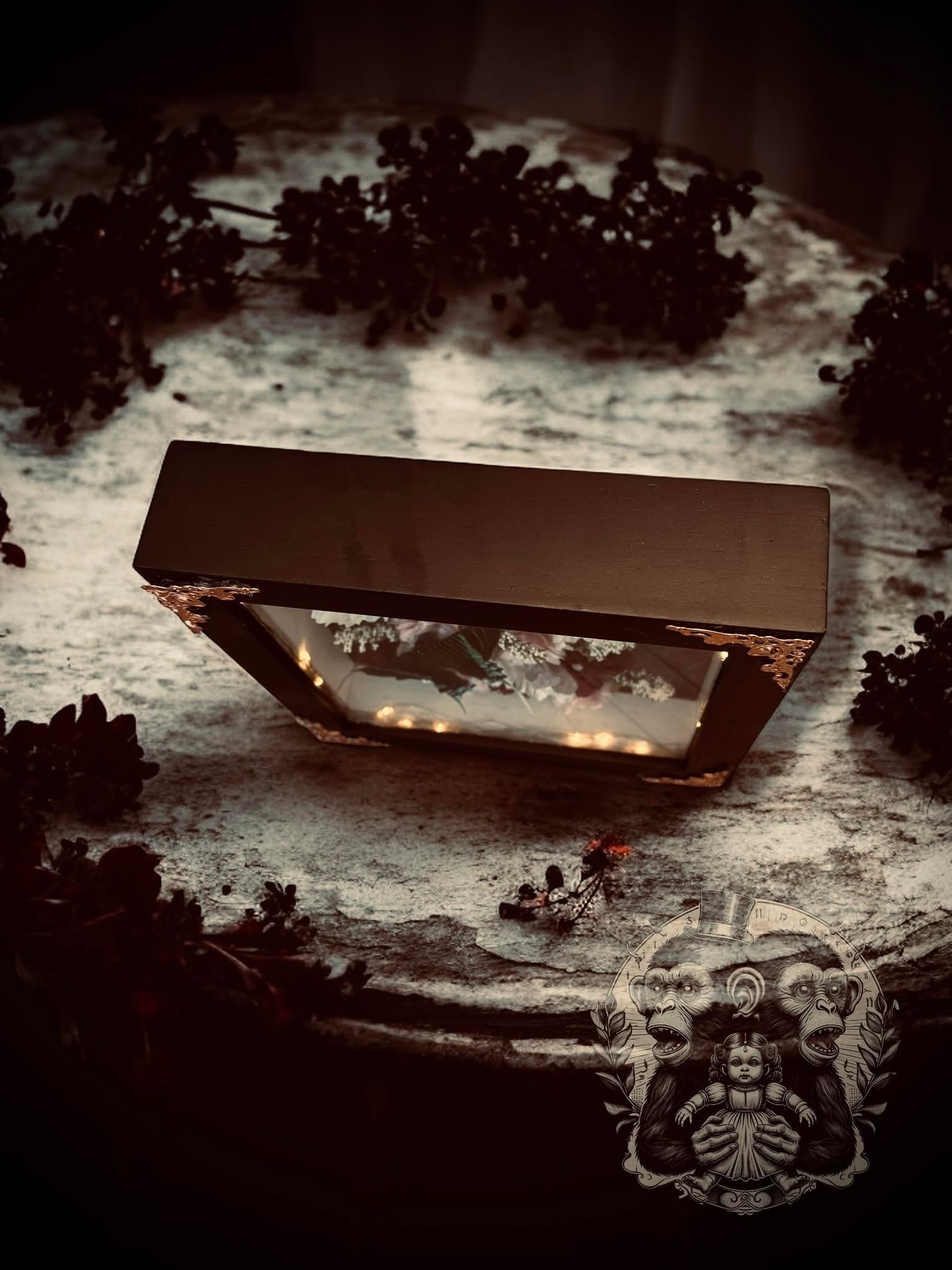 This one-of-a-kind shadow box features a real Butterfly, charming fake flowers, and magical selenide crystals, all set against an eerie, luminous backdrop.