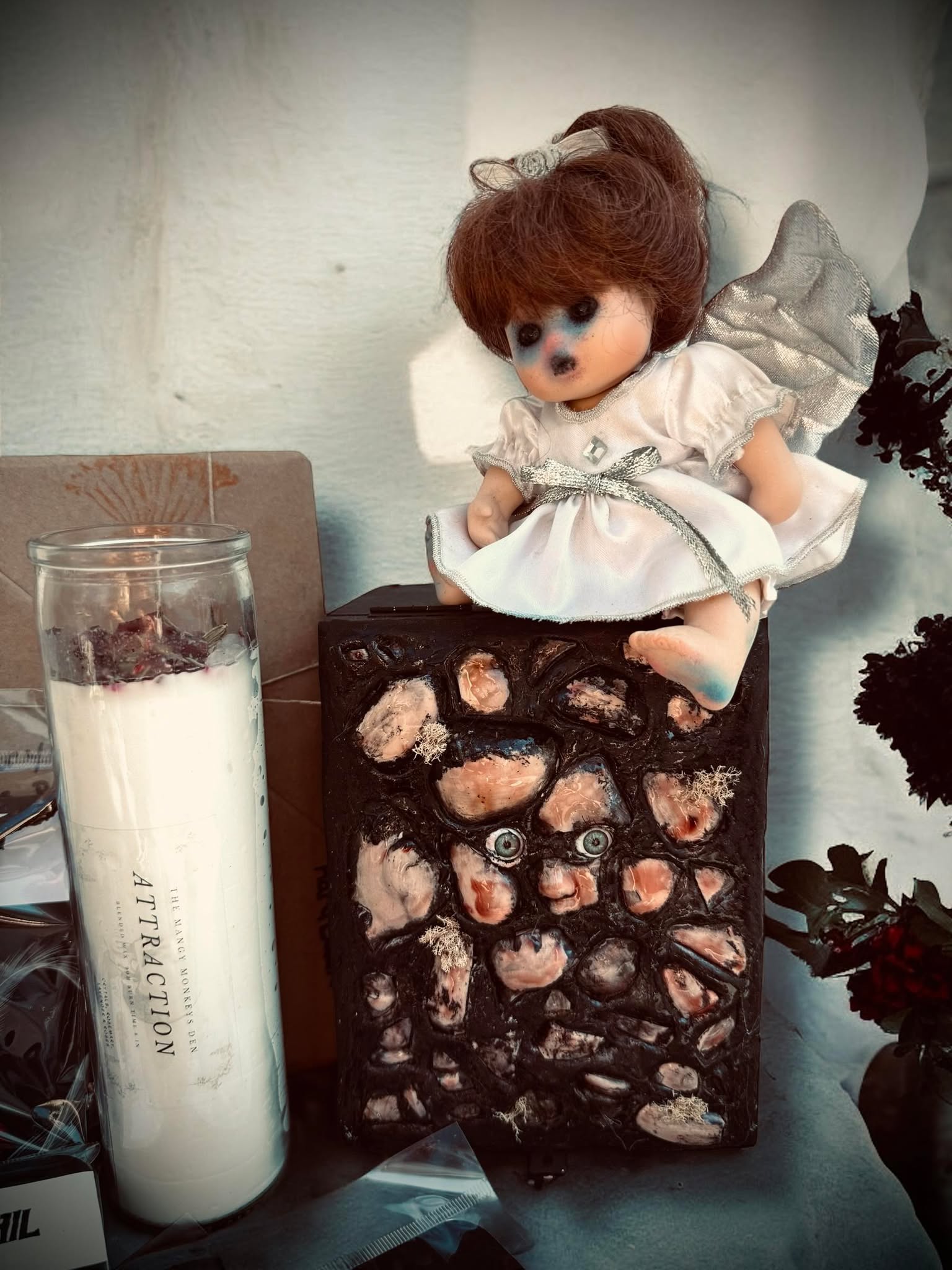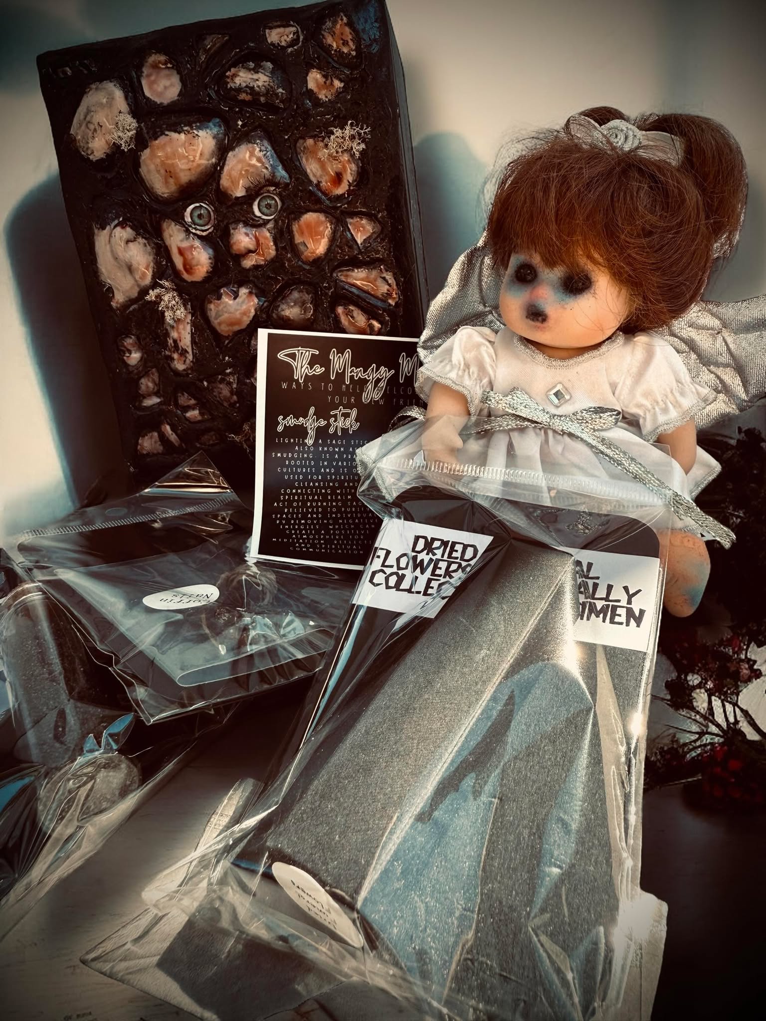 👻 One Mini Haunted doll - Take home this haunted host, crafted from a second-hand doll of a porcelain head, hands and legs with a stuffed body. They may have their fair share of "flaws," but that's part of their charmingly spooky story! (But, no promises on perfect condition here!)