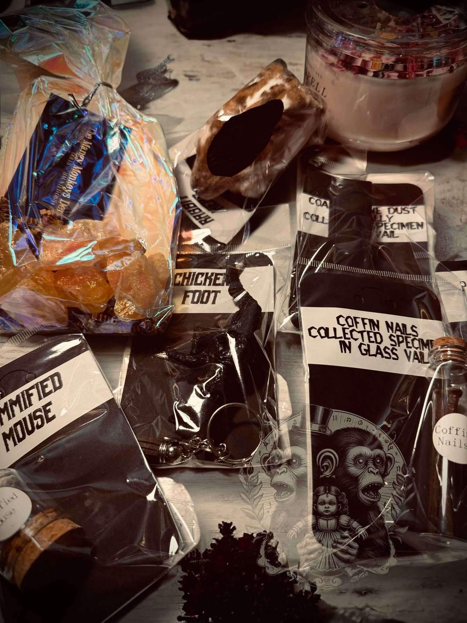 👻 One Mini Haunted doll - Take home this haunted host, crafted from a second-hand doll of a porcelain head, hands and legs with a stuffed body. They may have their fair share of "flaws," but that's part of their charmingly spooky story! (But, no promises on perfect condition here!)